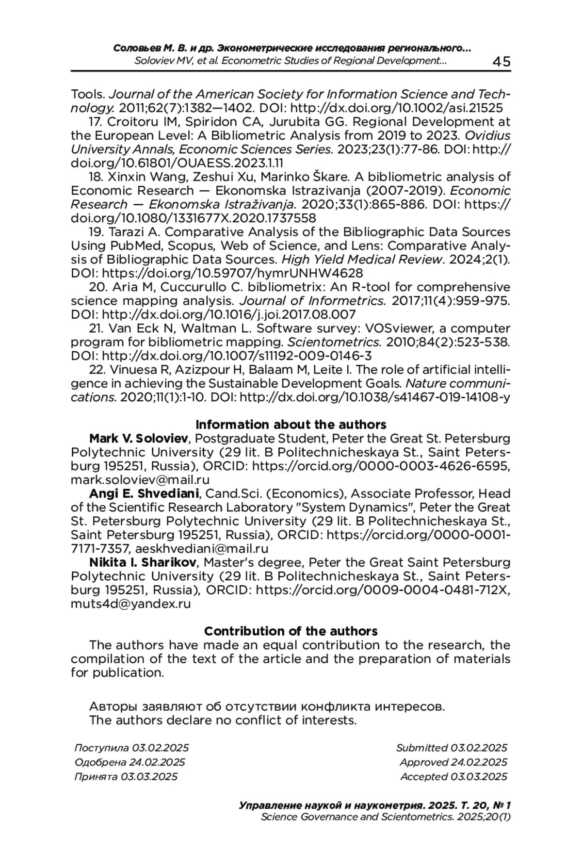 Заключение. Проведенный в рамках исследования библиометрический анализ позволил выявить ключевые направления научных работ в области эконометрического моделирования регионального развития. Разработанный авторами алгоритм и методология системного анализа библиографии дали возможность определить наиболее значимые и весомые научные труды в рассматриваемой области. Представленные разнообразные визуализации данных проиллюстрировали междисциплинарный характер рассмотренных исследований. Дальнейшие исследования в освещаемой области возможны в части поиска и внедрения новых перспективных методов библиометрического анализа данных.