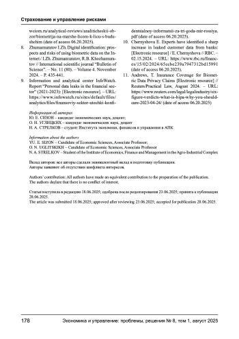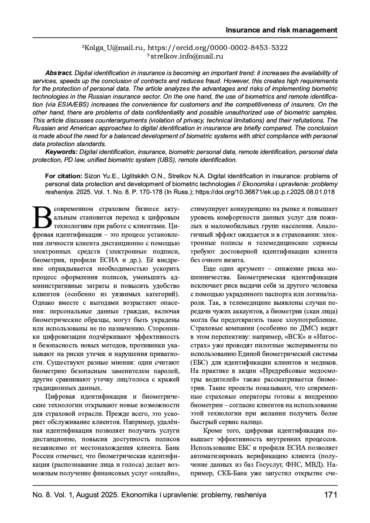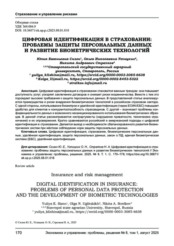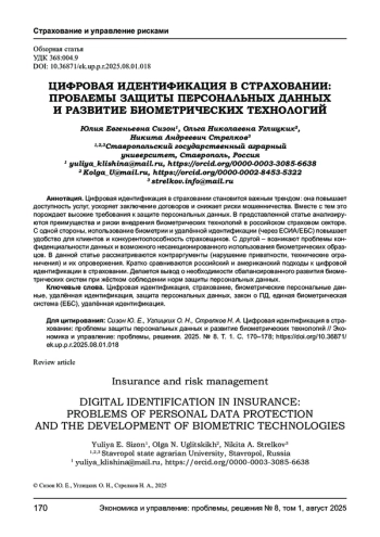 СИЗОН Ю. Е., УГЛИЦКИХ О. Н., СТРЕЛКОВ Н. А. ЦИФРОВАЯ ИДЕНТИФИКАЦИЯ В СТРАХОВАНИИ: ПРОБЛЕМЫ ЗАЩИТЫ ПЕРСОНАЛЬНЫХ ДАННЫХ И РАЗВИТИЕ БИОМЕТРИЧЕСКИХ ТЕХНОЛОГИЙ // ЭКОНОМИКА И УПРАВЛЕНИЕ: ПРОБЛЕМЫ, РЕШЕНИЯ. 2025. ТОМ 1 № 8