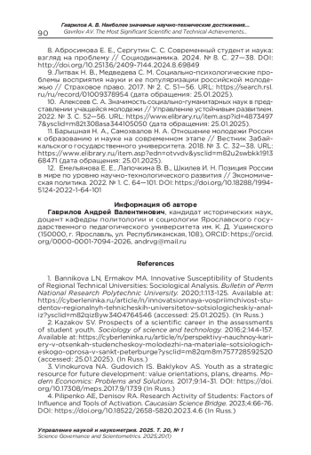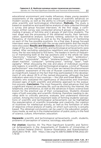 Введение. Настоящая статья посвящена исследованию восприятия наиболее значимых научно-технических достижений молодежной студенческой аудиторией. Основное внимание уделяется тому, как различные факторы, такие как социальный контекст, образовательная среда и медийные воздействия, формируют у молодежи оценку значимости научных достижений и их влияния на современное общество, а также способность к критическому анализу и систематизации научно-технической информации.