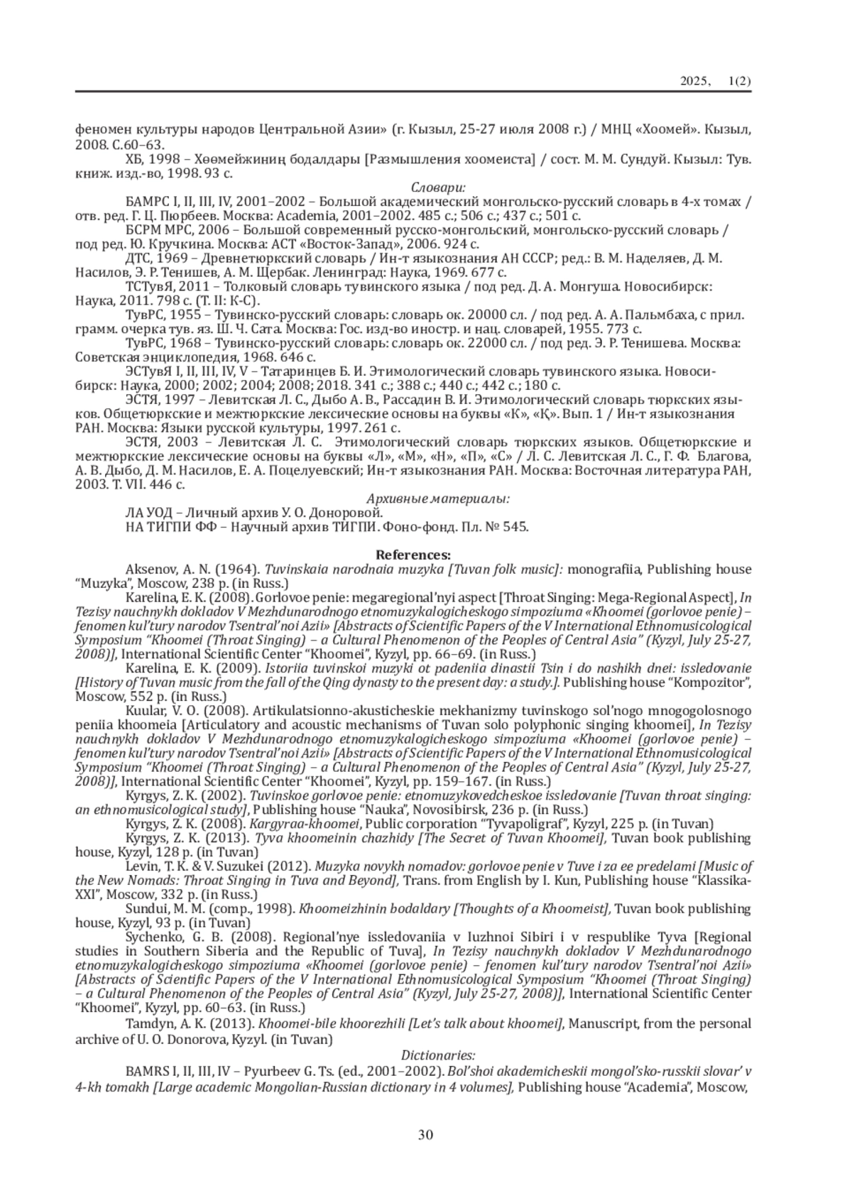 Дефиниция музыкальных терминов иногда подверженадескриптивному подходу, особенно в наименованиях инструментов, видов горлового пения и объяснениях заимствованных терминов. Словарные статьи не всегда содержат полныеэтимологические справки, сведения о времени фиксации висточниках и иллюстрации из художественной литературы исредств массовой информации. В первой части исследования(см. журнал за 2024 год) были представлены результаты по Первой группе терминов, обозначающих общее название горлового пения хоомей. Вовторой части исследования представлены результаты по группам терминов, обозначающих: разновидности горлового пения хоомей; специфические образовательные термины; иприемы корректировки дыхания во время исполнения хоомея.