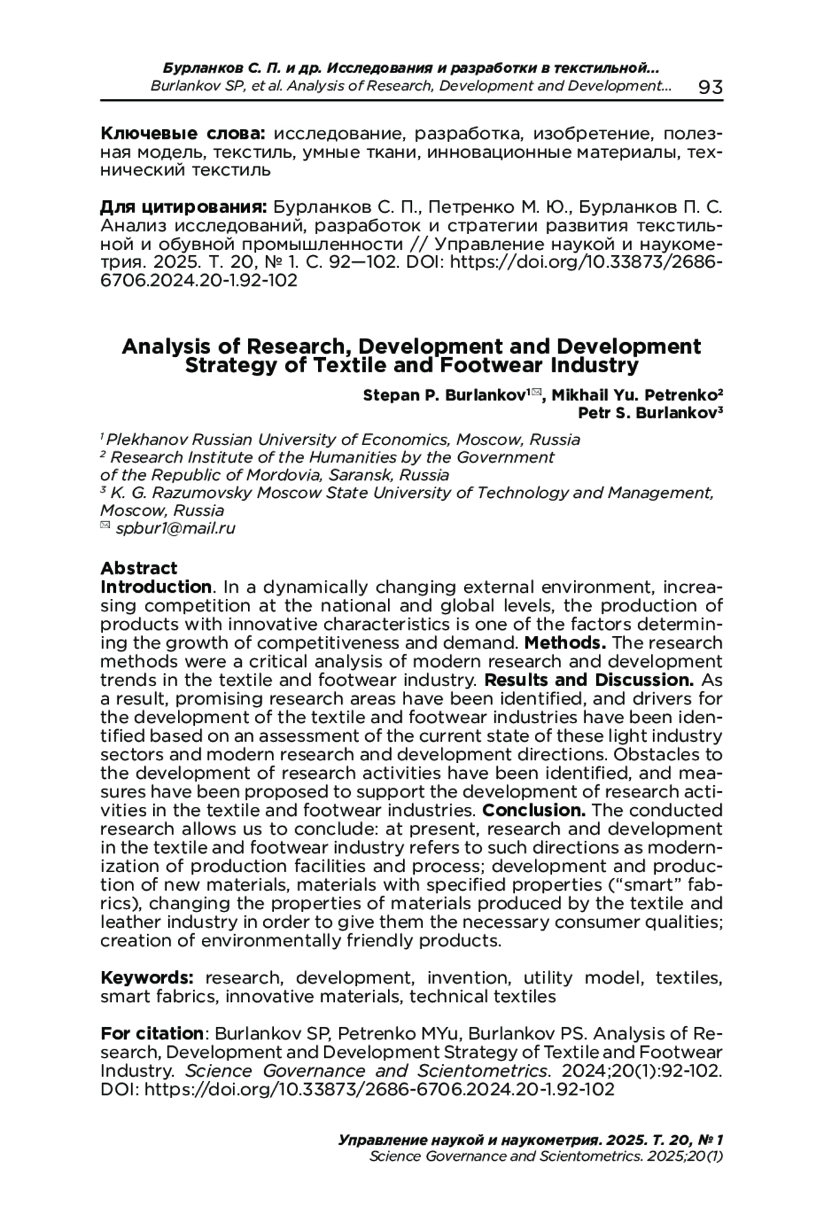 Заключение. Проведенное исследование позволяет сделать вывод: в настоящее время исследования и разработки в текстильной и обувной промышленности относятся к таким направлениям, как модернизация производственных мощностей и процессов; разработка и производство новых материалов, материалов с заданными свойствами («умные» ткани), изменение свойств выпускаемых текстильной и кожевенной промышленностью материалов с целью придать им необходимые потребительские качества; создание экологически чистой продукции.