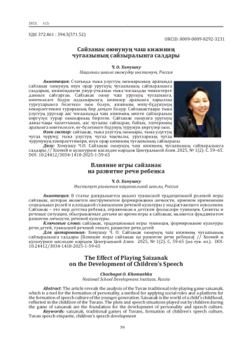 4. Мендот Эл. Э., Мендот И. Э., Мендот Эм. Э., Монгуш В. Б. Игра “Сайзанак” детей кочевого народа // Педагогико-психологические и медико-биологические проблемы физической культуры и спорта. 2022. №17(2). С. 154-160. DOI: 10.14526/2070-4798-2022-17-2-154-160 EDN: GKQWRK