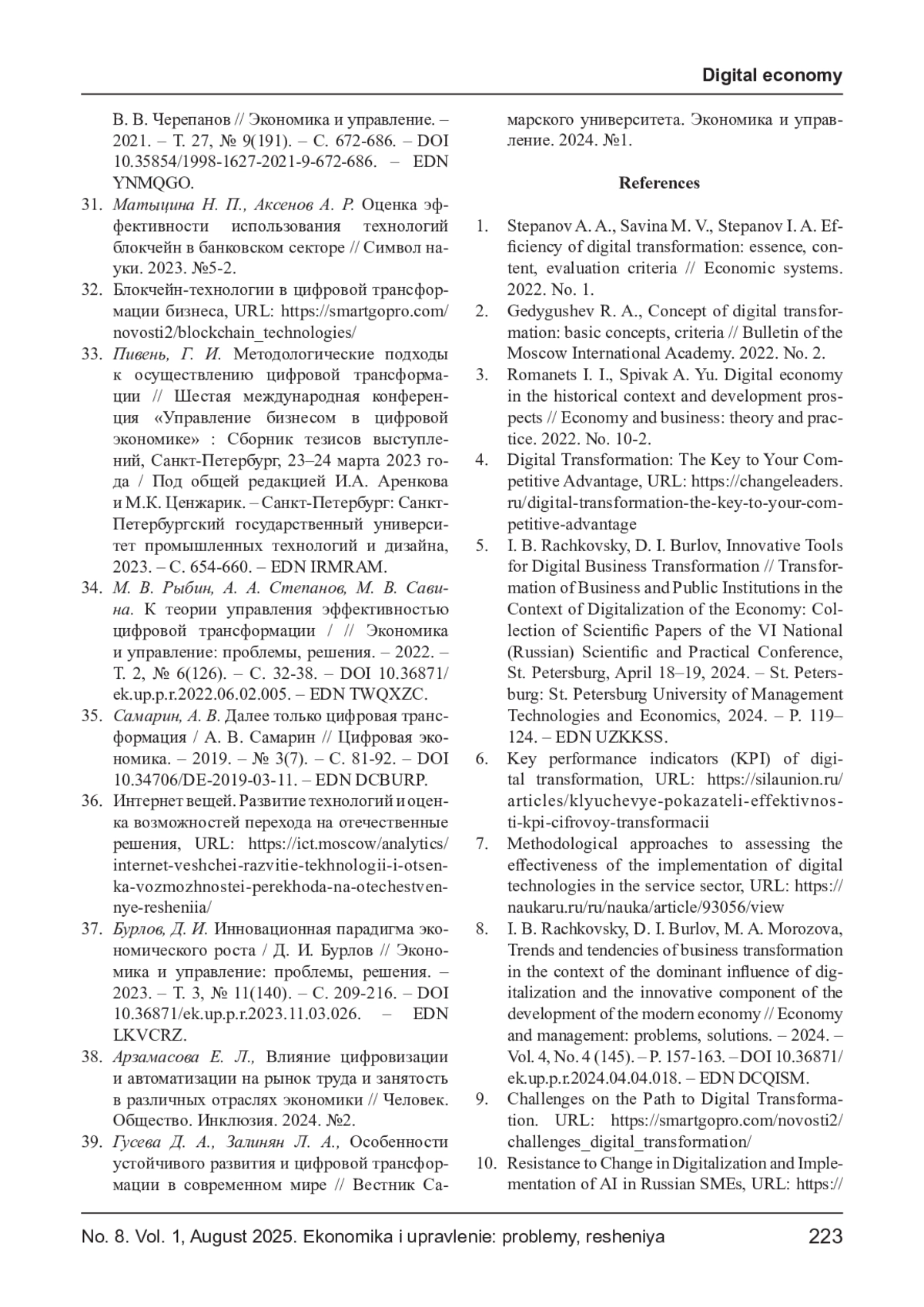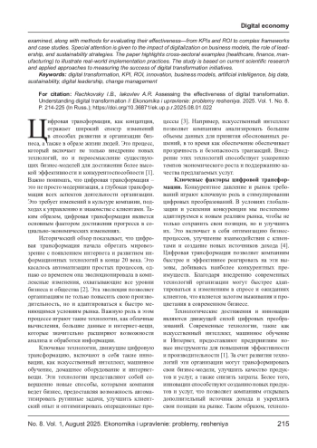РАЧКОВСКИЙ И. Б., ЯКОВЛЕВ А. Р. ОЦЕНКА ЭФФЕКТИВНОСТИ ЦИФРОВОЙ ТРАНСФОРМАЦИИ. ПОНИМАНИЕ ЦИФРОВОЙ ТРАНСФОРМАЦИИ // ЭКОНОМИКА И УПРАВЛЕНИЕ: ПРОБЛЕМЫ, РЕШЕНИЯ. 2025. ТОМ 1 № 8