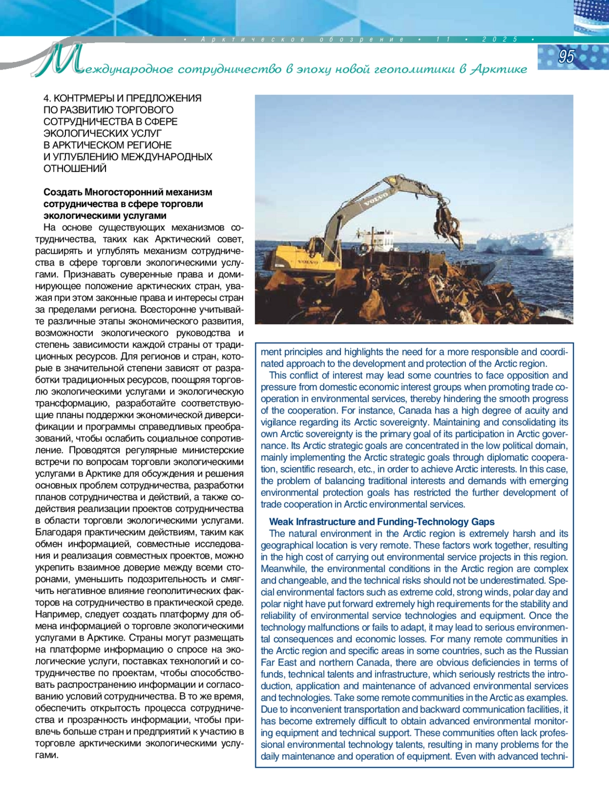 В связи с глобальным потеплением Арктический регион сталкивается с серьезными экологическими проблемами, в то время как его стратегическая и экономическая ценность становится все более очевидной, вызывая конкуренцию между странами за освоение арктических ресурсов и геополитические интересы. На этом фоне важность экологического сотрудничества в Арктике достигла беспрецедентных высот. Торговля экологическими услугами, определяемая как коммерческая деятельность, обеспечивающая охрану окружающей среды, борьбу с загрязнением, восстановление окружающей среды и сопутствующие услуги, играет решающую роль в развитии международных отношений в Арктике. В статье рассматривается текущее состояние торговли экологическими услугами в Арктике, включая ее масштабы, потенциал, модели сотрудничества и обмен технологическими инновациями. Далее в нем анализируется роль этого торгового сотрудничества в укреплении взаимодействия между арктическими государствами, содействии экономическим преобразованиям и устойчивому развитию, а также в укреплении потенциала экологического управления. Одновременно в нем раскрываются проблемы, с которыми сталкивается сотрудничество в сфере торговли экологическими услугами в Арктике, такие как геополитическое вмешательство, трудности с балансированием традиционных интересов с новыми целями в области охраны окружающей среды, слабая инфраструктура, а также нехватка финансирования и технологий. В заключение предлагаются соответствующие стратегические рекомендации, направленные на укрепление сотрудничества в сфере торговли экологическими услугами в Арктике и достижение устойчивого развития и мирной стабильности в регионе.