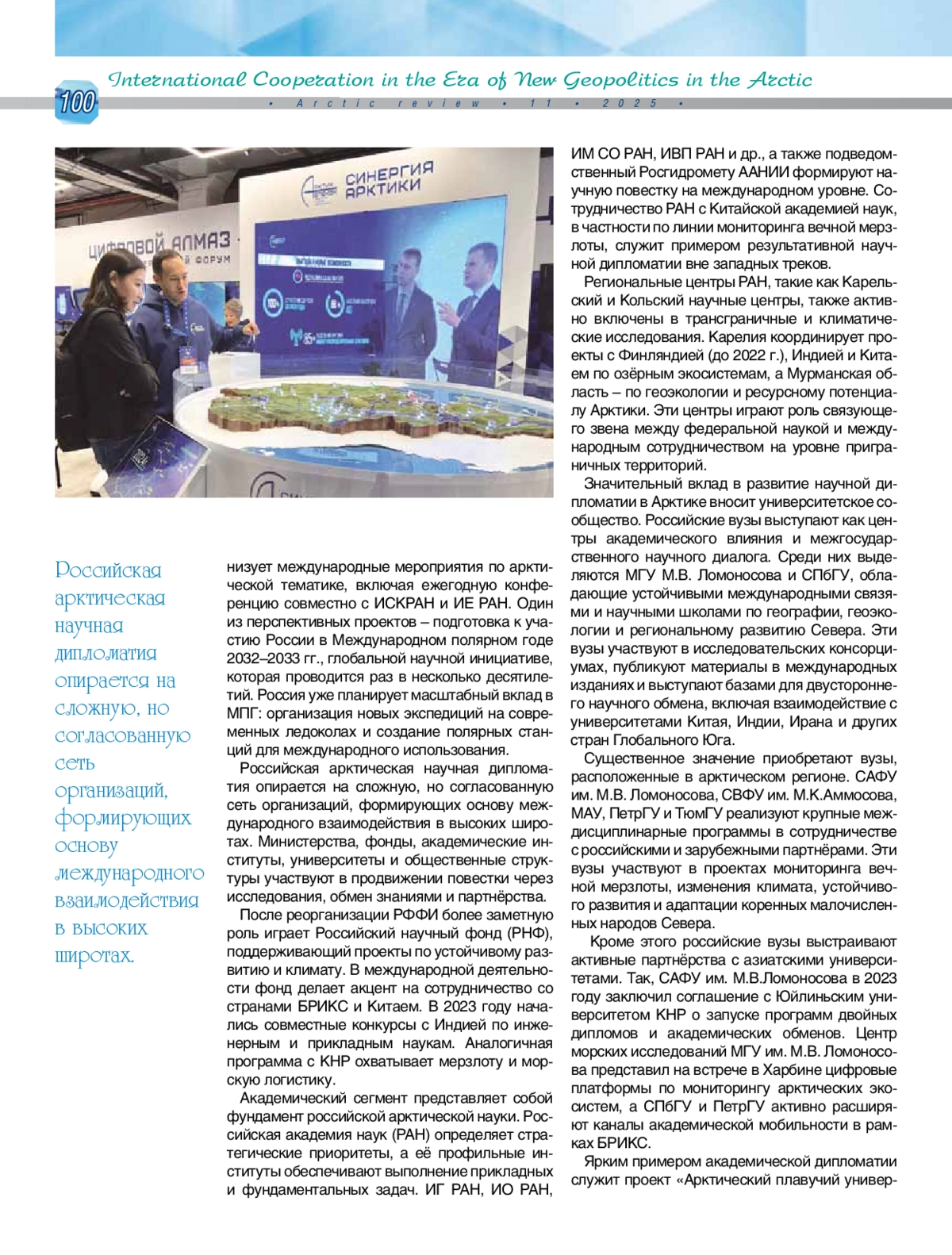 Однако, экономических намерений недостаточно: Арктика – хрупкая экосистема, требующая международной координации усилий в сфере экологии, науки и безопасности. В условиях глобальной турбулентности и санкций, которые коллективный Запад применяет против России, научная дипломатия приобретает всё большее значение. Научное сотрудничество остаётся одной из немногих относительно нейтральных площадок, где может продолжаться конструктивный диалог несмотря на политические разногласия.
