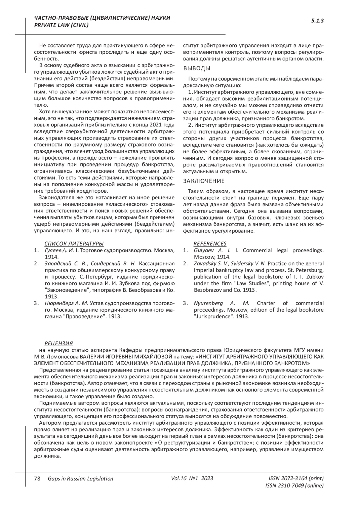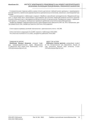 Арбитражный управляющий как ключевая фигура процесса несостоятельности (банкротства) занимает важную позицию в иерархии факторов, влияющих на судьбу должника в части возможности восстановления платежеспособности. В связи с этим потенциалом автор настоящей статьи рассматривает институт арбитражного управляющего с точки зрения концепции обеспечительного механизма реализации прав должника и приходит к выводу о том, что, с одной стороны, такой менеджер является гарантом прав должника, признанного банкротом, с другой стороны, данный институт переживает в настоящее время определенный кризис, выход из которого будет иметь решающее значение для всего обеспечительного механизма.