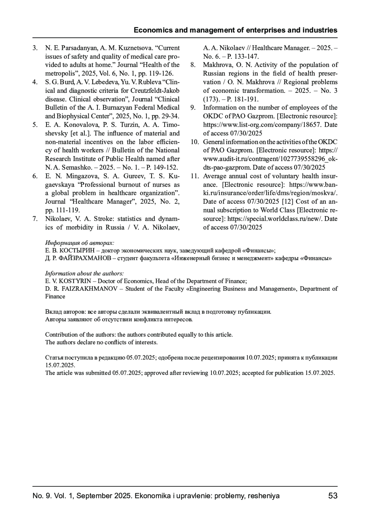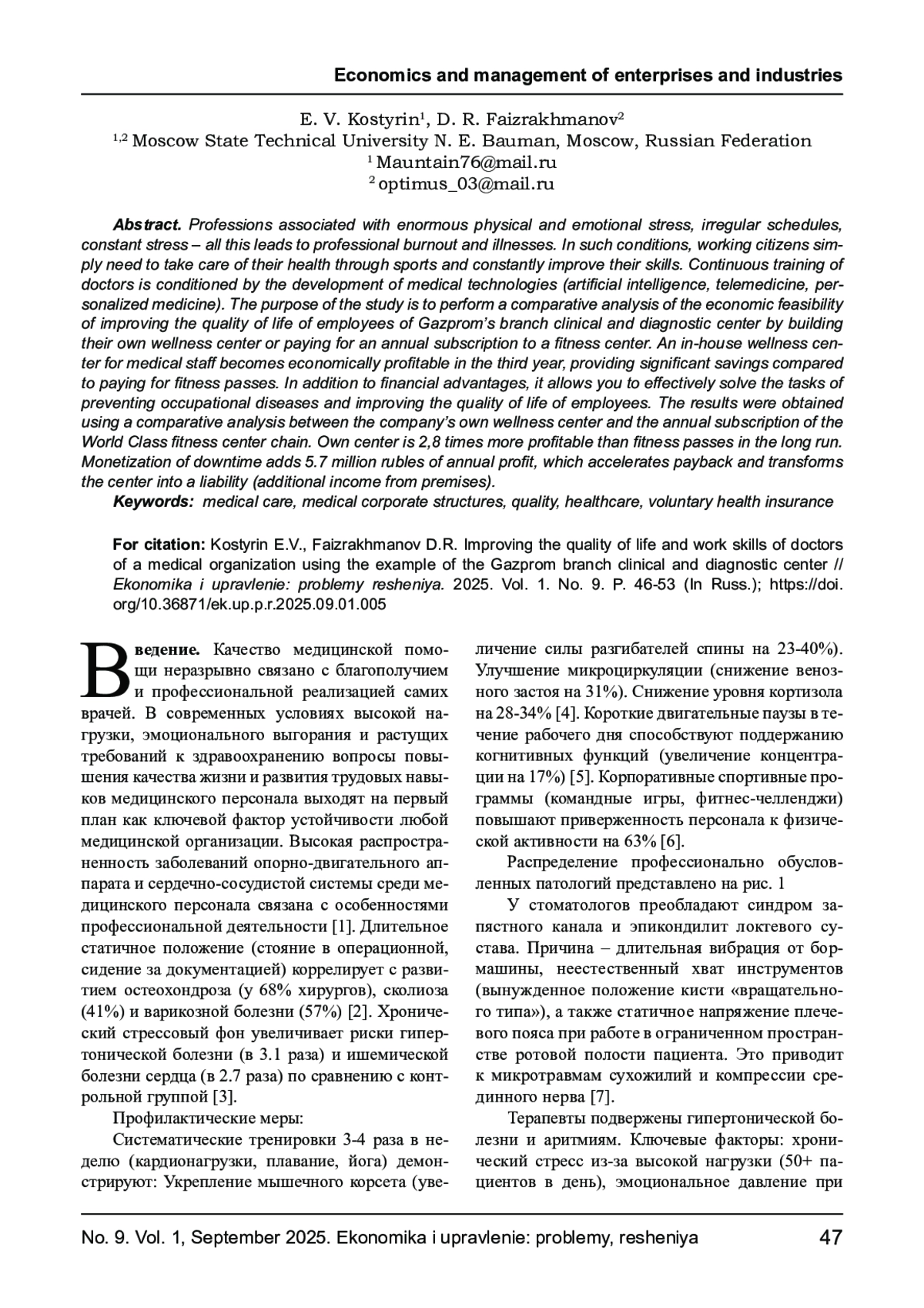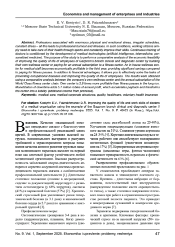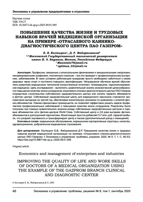 КОСТЫРИН Е. В., ФАЙЗРАХМАНОВ Д. Р. ПОВЫШЕНИЕ КАЧЕСТВА ЖИЗНИ И ТРУДОВЫХ НАВЫКОВ ВРАЧЕЙ МЕДИЦИНСКОЙ ОРГАНИЗАЦИИ НА ПРИМЕРЕ «ОТРАСЛЕВОГО КЛИНИКО- ДИАГНОСТИЧЕСКОГО ЦЕНТРА ПАО ГАЗПРОМ» // ЭКОНОМИКА И УПРАВЛЕНИЕ: ПРОБЛЕМЫ, РЕШЕНИЯ. 2025. ТОМ 1 № 9
