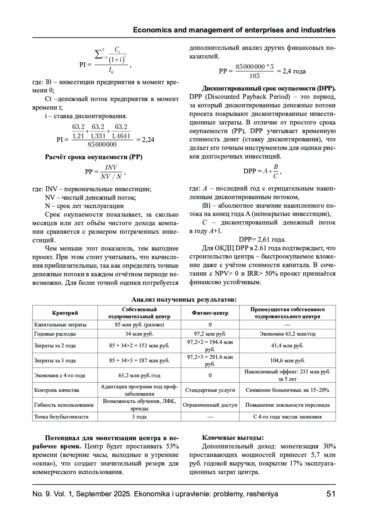 Цель исследования - выполнить сравнительный анализ экономической целесообразности повышения качества жизни сотрудников отраслевого клинико-диагностического центра ПАО Газпром посредством строительства собственного оздоровительного центра или оплаты годового абонемента в фитнес центре. Собственный оздоровительный центр для медицинского персонала становится экономически выгодным на третий год, обеспечивая значительную экономию по сравнению с оплатой фитнес-абонементов. Помимо финансовых преимуществ, он позволяет эффективно решать задачи профилактики профессиональных заболеваний и повышения качества жизни сотрудников. Результаты были получены при помощи сравнительного анализа между собственным оздоровительным центром и годовым абонементом сети фитнес-центров World Class. Собственный центр в 2,8 раза выгоднее фитнесабонементов в долгосрочной перспективе. Монетизация простоя добавляет 5,7 млн. руб. годовой прибыли, что ускоряет окупаемость и трансформирует центр в пассив (дополнительный доход с помещений).