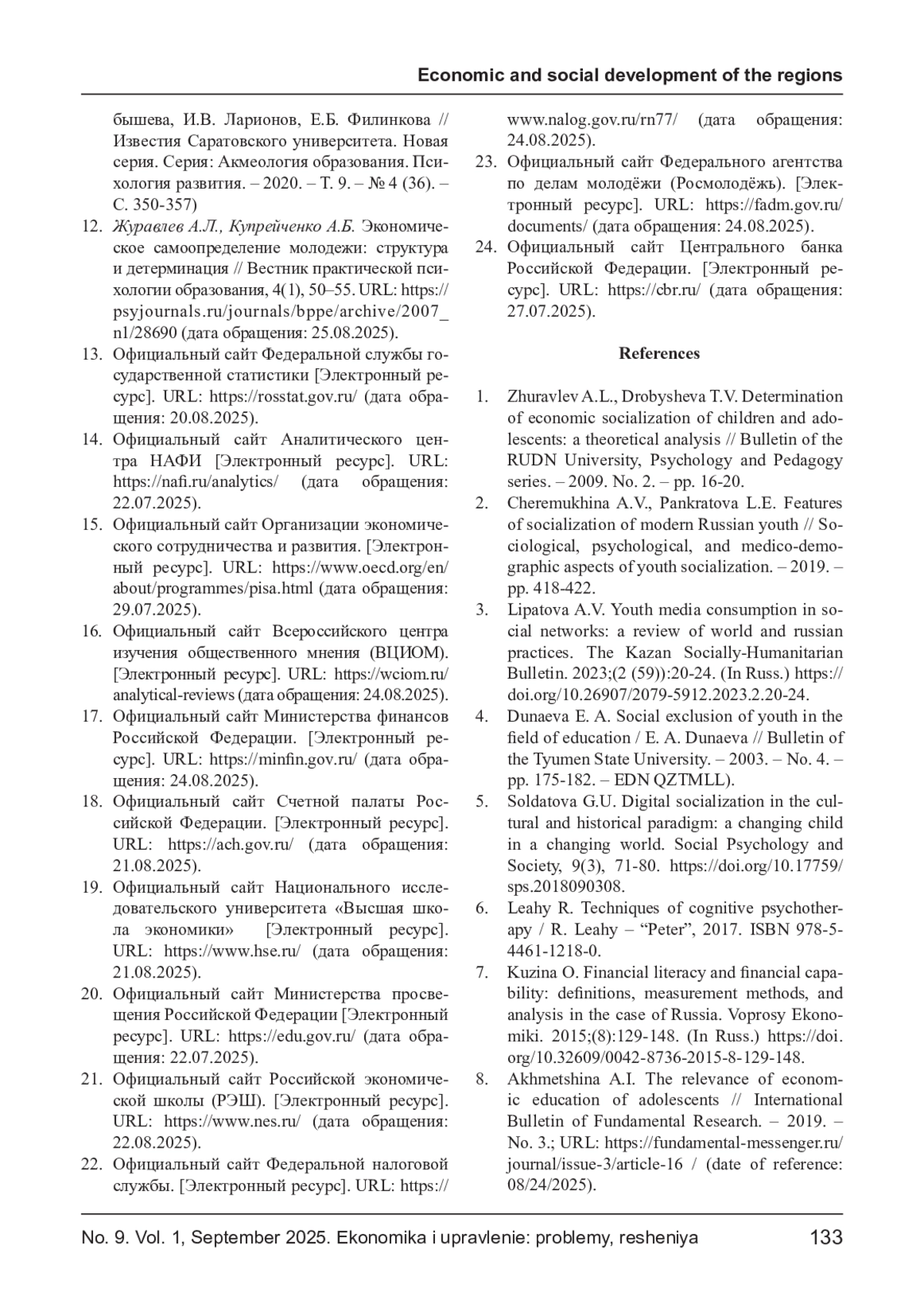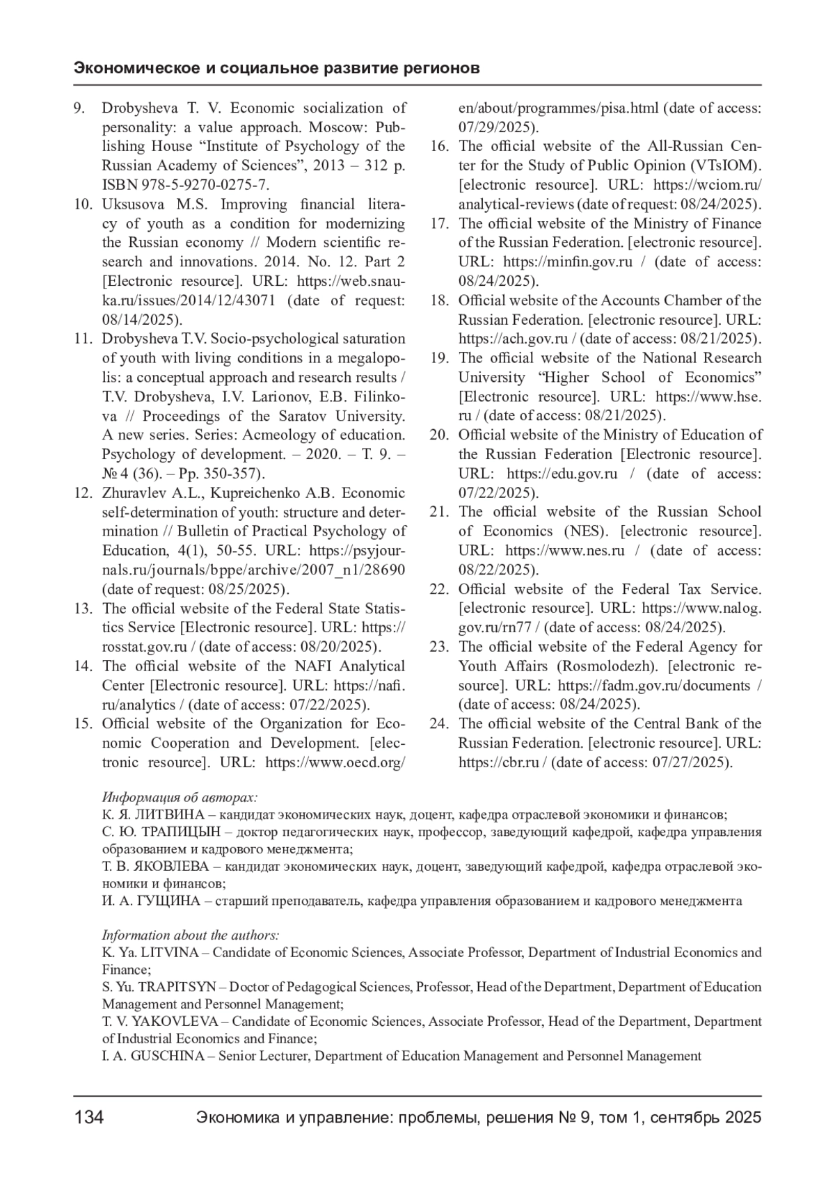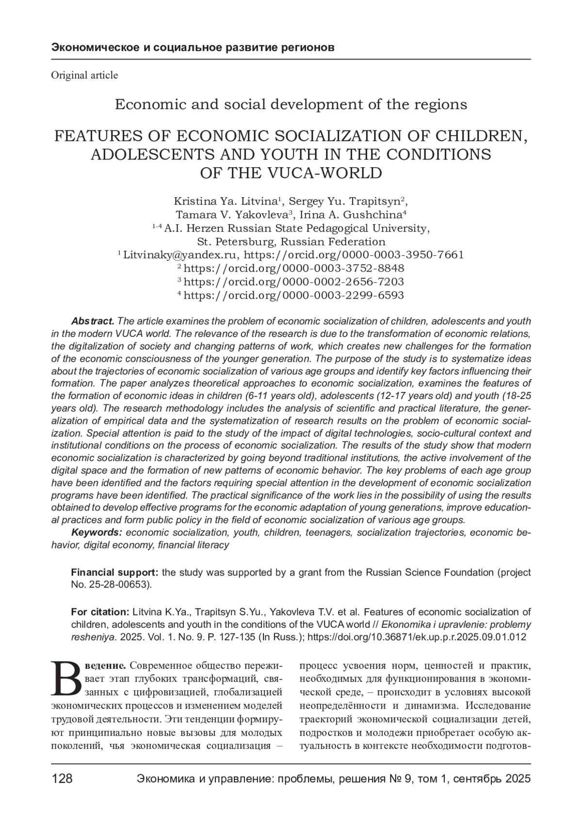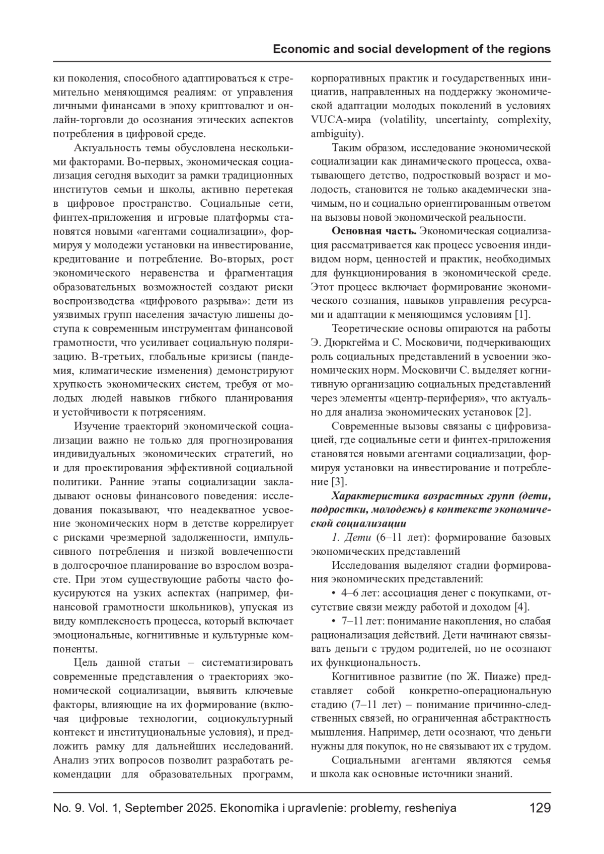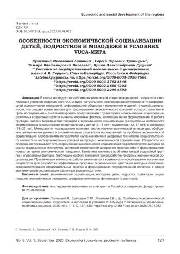 ЛИТВИНА К. Я., ТРАПИЦЫН С. Ю., ЯКОВЛЕВА Т. В., ГУЩИНА И. А. ОСОБЕННОСТИ ЭКОНОМИЧЕСКОЙ СОЦИАЛИЗАЦИИ ДЕТЕЙ, ПОДРОСТКОВ И МОЛОДЕЖИ В УСЛОВИЯХ VUCA-МИРА // ЭКОНОМИКА И УПРАВЛЕНИЕ: ПРОБЛЕМЫ, РЕШЕНИЯ. 2025. ТОМ 1 № 9