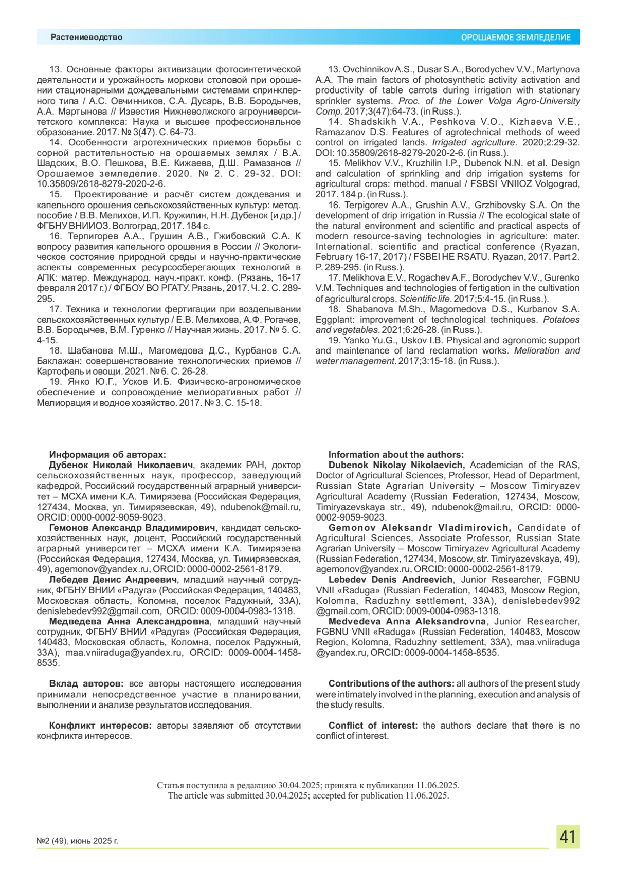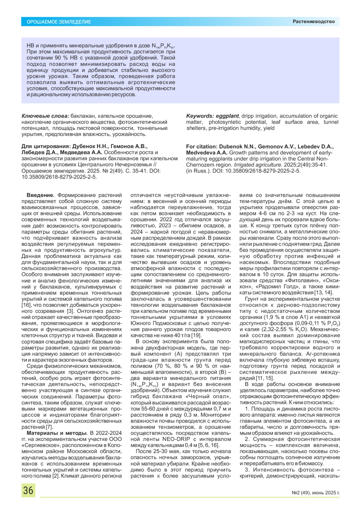 ДУБЕНОК Н. Н., ГЕМОНОВ А. В., ЛЕБЕДЕВ Д. А., МЕДВЕДЕВА А. А. ОСОБЕННОСТИ РОСТА И ЗАКОНОМЕРНОСТИ РАЗВИТИЯ РАННИХ БАКЛАЖАНОВ ПРИ КАПЕЛЬНОМ ОРОШЕНИИ В УСЛОВИЯХ ЦЕНТРАЛЬНОГО НЕЧЕРНОЗЕМЬЯ // ОРОШАЕМОЕ ЗЕМЛЕДЕЛИЕ. 2025. № 2 (49)