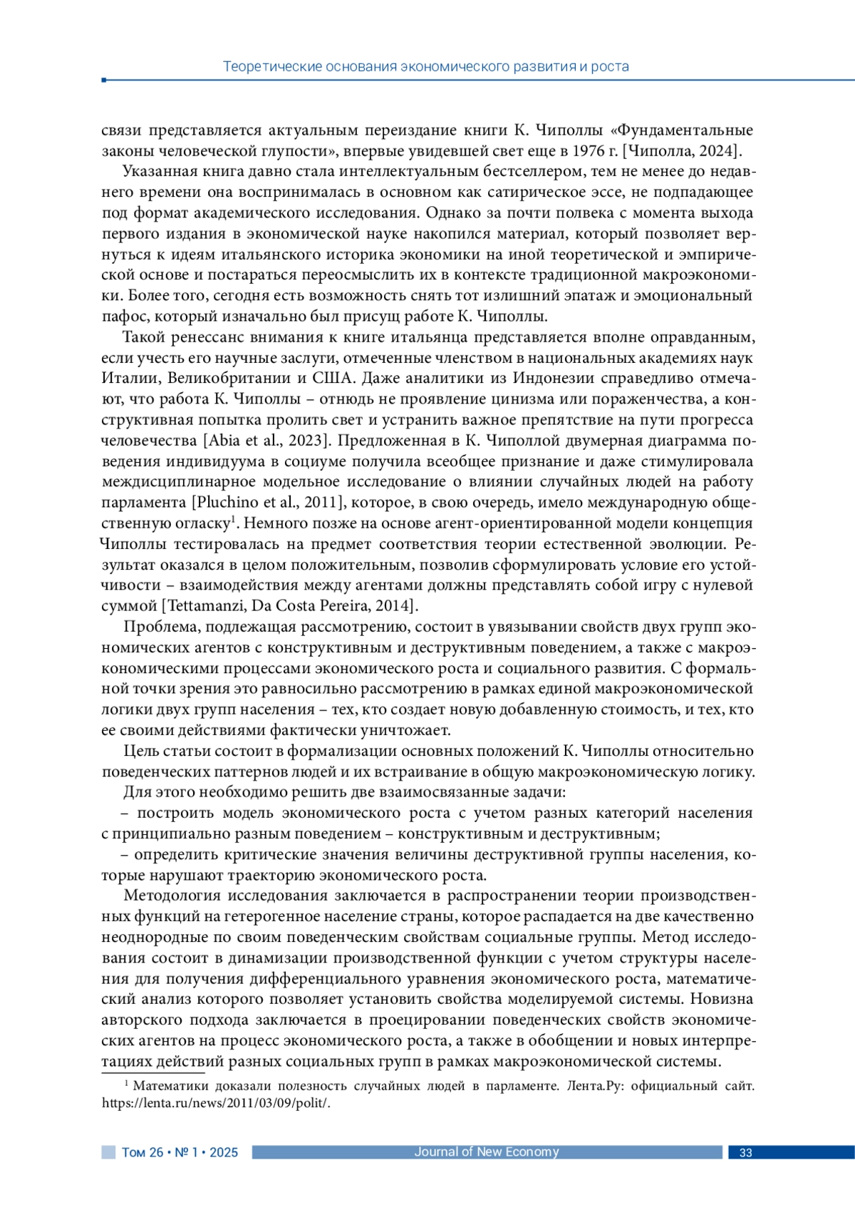 Макроэкономическая концепция человеческой глупости, предложенная Карло Чиполлой в 1976 г., позволяет рассматривать влияние группы лиц с деструктивным поведением на траекторию экономического роста. Статья посвящена построению макроэкономической теории деструктивности на основе формализации участия двух социальных групп – «глупцов» и «умников» – в национальной экономике. Методология исследования состоит в распространении теории производственных функций на гетерогенное население страны, которое распадается на две качественно неоднородные по своим поведенческим свойствам социальные группы. Метод включал динамизацию производственной функции с учетом структуры населения для получения дифференциального уравнения экономического роста, которое позволяет определить свойства моделируемой системы. Полученное уравнение установило критические доли группы «глупцов» для локального и глобального режимов развития. В первом случае нарушается рост душевого ВВП, а во втором – рост объема ВВП. Аналитическое исследование режимов построенной модели выявило свойство минимальной разумности общества, согласно которому для поддержания режима макроэкономической эффективности умные люди должны обеспечить себе минимальное влияние в системе управления и производства. Построенная модель может иметь три эквивалентные трактовки – макроэкономики глупости, ошибок и вреда. В первом случае рассматриваются два типа экономических агентов с рациональным и иррациональным поведением, во втором – успешно или неудачно решаемые задачи, в третьем – совместное действие населения, ведущее созидательную деятельность по увеличению ВВП, и когорты «диверсантов», занятых контрпродуктивной работой по нарушению общественного порядка и нанесению национальной экономике ущерба. Расширение интерпретаций исходной модели позволяет перейти к обобщенной трактовке в терминах макроэкономики деструктивности