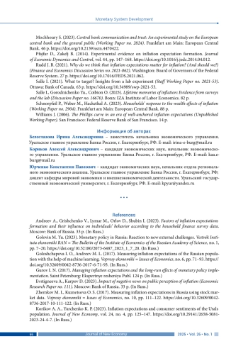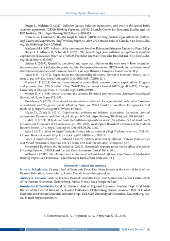 1. Андреев А., Грищенко В., Лымарь М., Орлов Д., Шубин И. (2023). Факторы формирования инфляционных ожиданий и их влияние на поведение индивидов по данным обследования финансов домохозяйств. Аналитическая записка. Москва: Центральный банк Российской Федерации. 33 с.