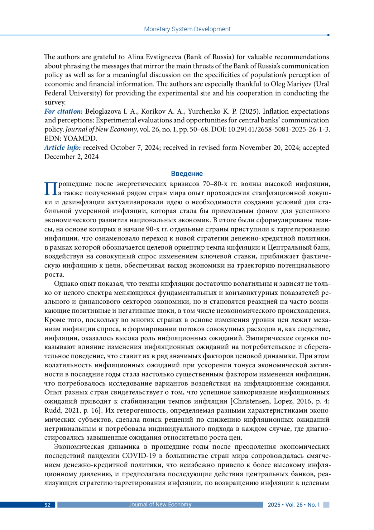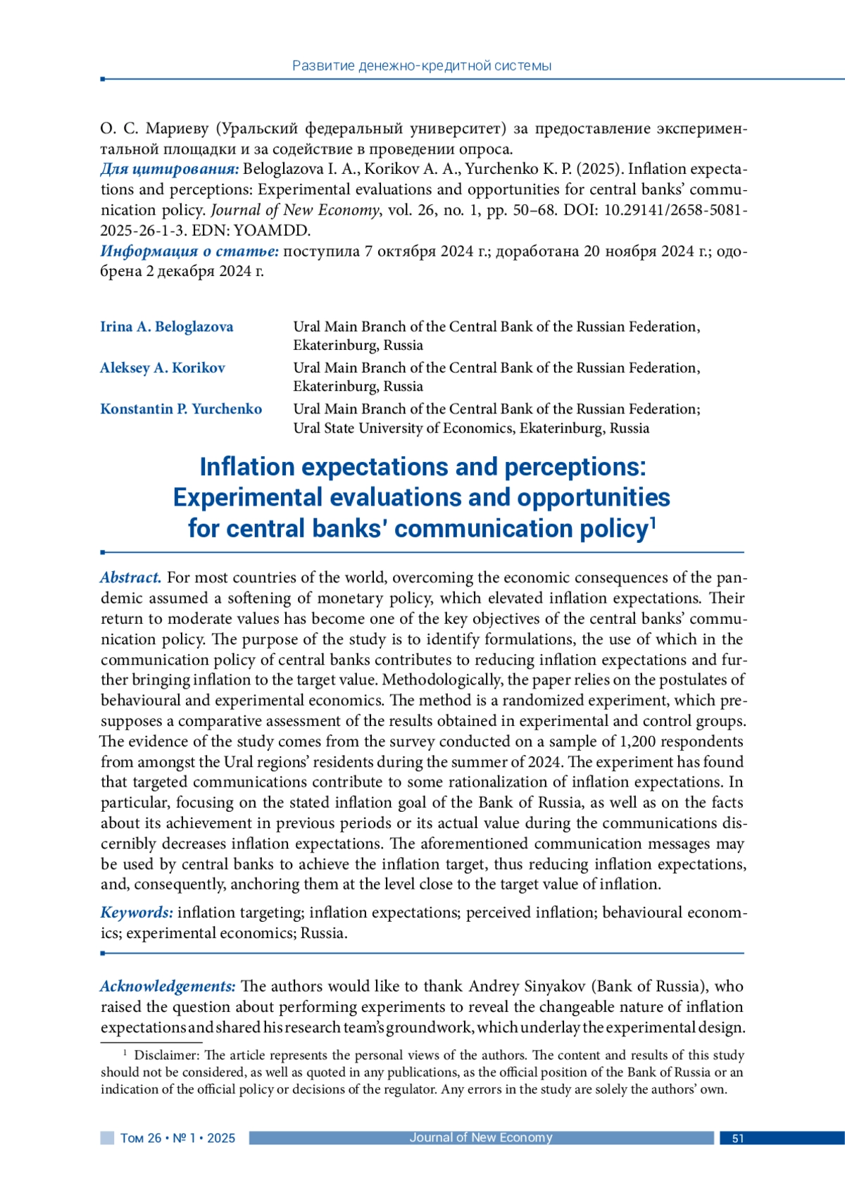 Преодоление экономических последствий пандемии для большинства стран мира предполагало смягчение денежно-кредитной политики, что сформировало повышенные инфляционные ожидания. Их возврат к умеренным значениям стал одной из ключевых задач коммуникационной политики центральных банков. Статья посвящена выявлению формулировок, применение которых в коммуникациях способствует снижению инфляционных ожиданий и приведению инфляции к целевому значению. Методологическую основу составили постулаты поведенческой и экспериментальной экономики. Использовался метод рандомизированного опросного эксперимента, предполагающий сравнительные оценки полученных результатов в целевых и контрольных группах. Информационной базой послужил опрос 1 200 респондентов из числа жителей макрорегиона Урал, проведенный весной 2024 г. Результаты эксперимента показали, что направленные коммуникации способствуют некоторой рационализации инфляционных ожиданий. В частности, акцентирование в ходе коммуникаций внимания на заявленной цели Центрального банка Российской Федерации по инфляции, а также на фактах о ее достижении в прошлые периоды и на фактическом значении ощутимо снижают инфляционные ожидания. Данные коммуникационные посылы могут стать одним из инструментов, применяемых центральным банком для достижения целевого показателя инфляции, способствуя снижению инфляционных ожиданий, а, следовательно, их заякориванию на уровне, близкому к целевому значению инфляции