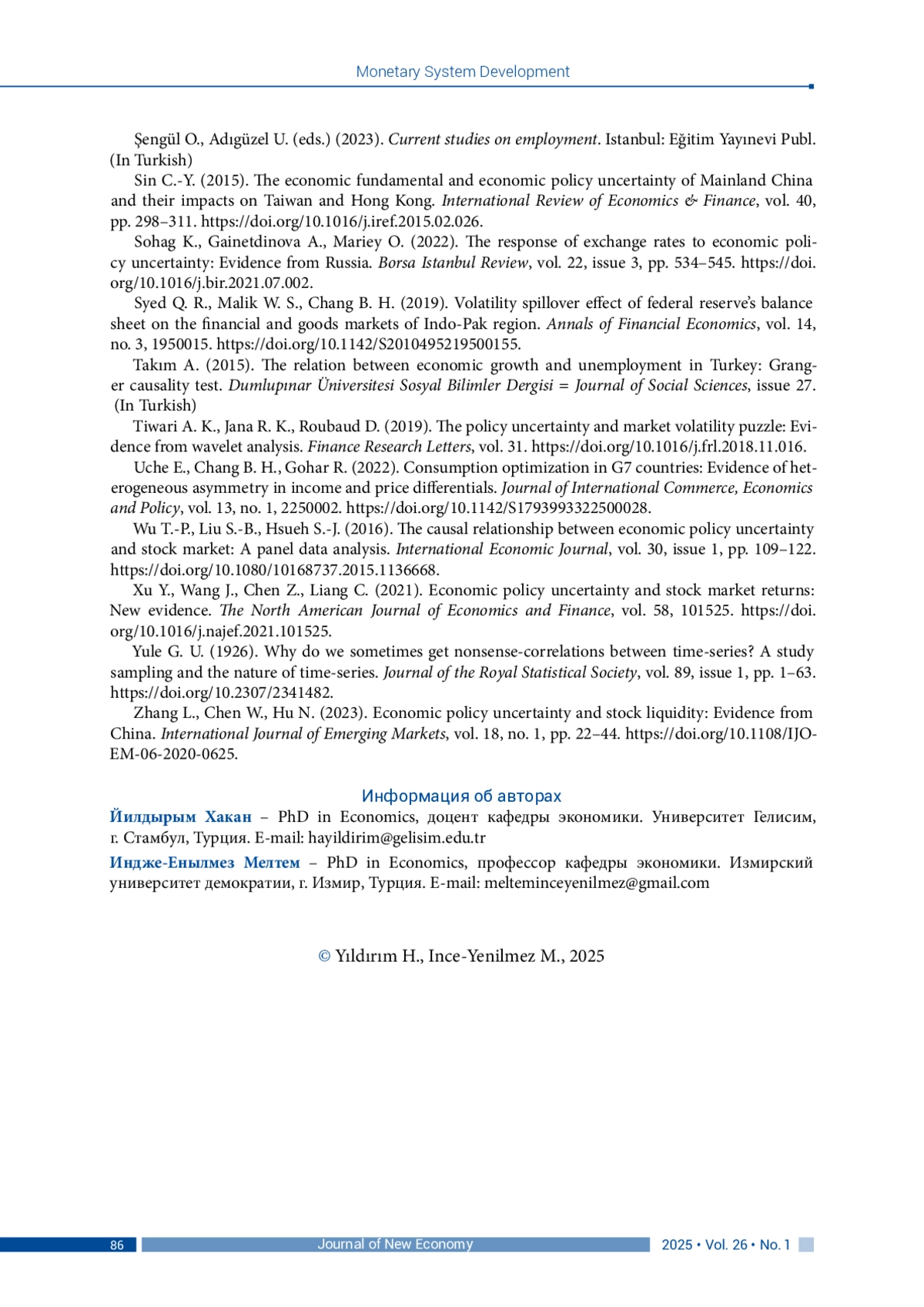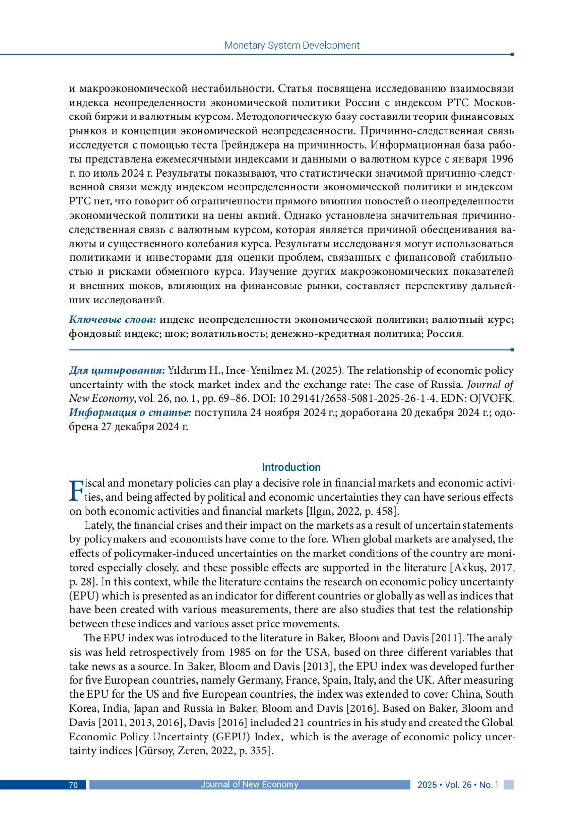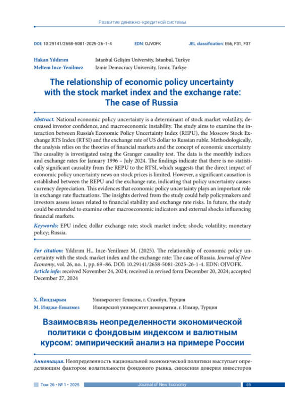 YILDIRIM H., INCE-YENILMEZ M. THE RELATIONSHIP OF ECONOMIC POLICY UNCERTAINTY WITH THE STOCK MARKET INDEX AND THE EXCHANGE RATE: THE CASE OF RUSSIA // JOURNAL OF NEW ECONOMY. 2025. Т. 26 № 1