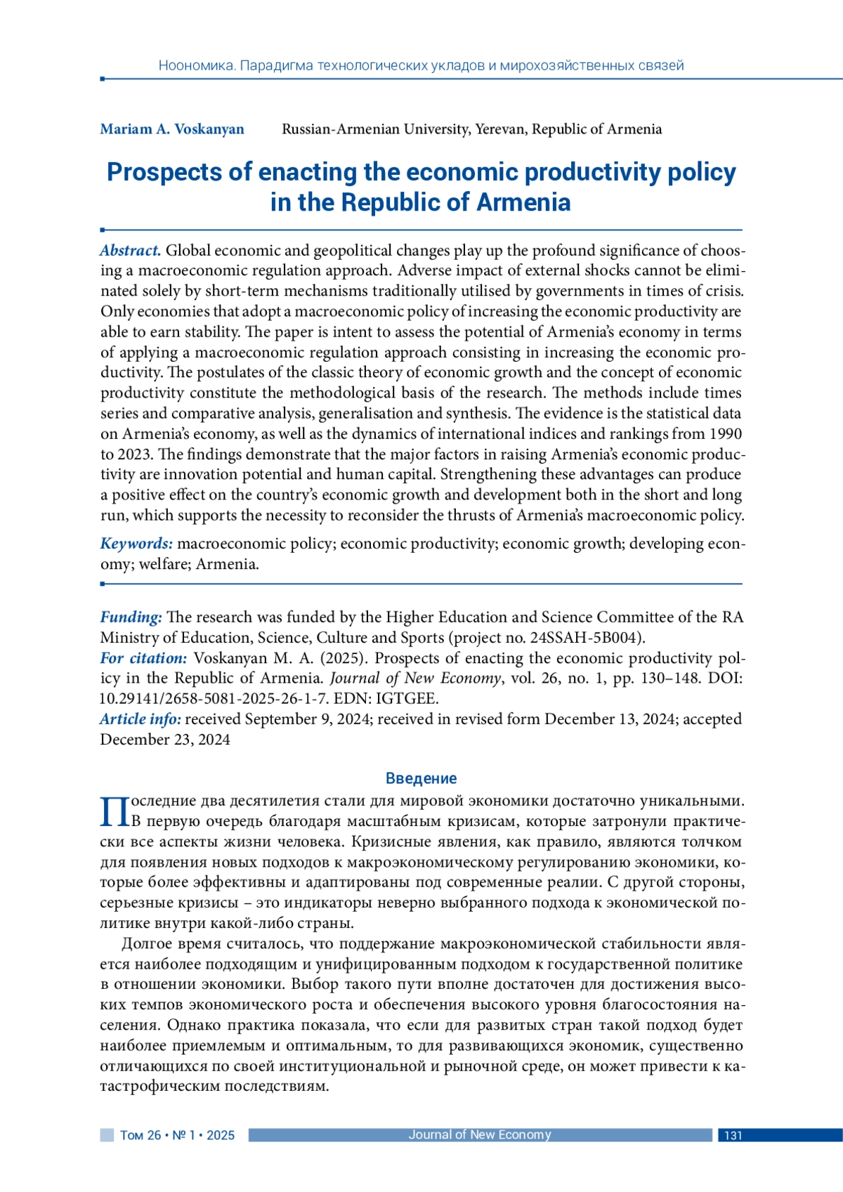 Глобальные экономические и геополитические изменения обуславливают высокую значимость выбора подхода к макроэкономическому регулированию. Негативное влияние внешних шоков стало невозможно нивелировать краткосрочными механизмами, которые традиционно используются правительствами в периоды кризисов. Устойчивыми остаются экономики, которые взяли за основу макроэкономической политики повышение производительности экономики. Статья посвящена оценке потенциала экономики Армении в контексте применения подхода к макроэкономическому регулированию, основанному на повышении производительности экономики. Методологической базой исследования послужили постулаты классической теории экономического роста и концепция производительности экономики. В работе использованы методы анализа рядов динамики, сравнительного анализа, обобщения и синтеза. Информационную базу составили статистические данные по экономике Армении, а также значения международных индексов и рейтингов с 1990 по 2023 гг. Выявлено, что ключевыми факторами повышения производительности экономики Армении выступают инновационный потенциал и человеческий капитал. Усиление данных преимуществ может оказать положительное влияние на экономический рост и развитие страны как в краткосрочной, так и в долгосрочной перспективе, что обуславливает необходимость пересмотра направлений макроэкономической политики Армении