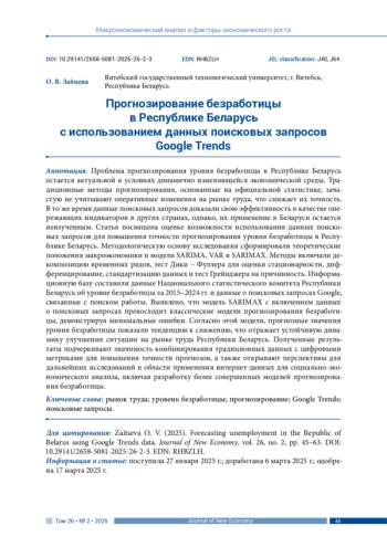 Проблема прогнозирования уровня безработицы в Республике Беларусь остается актуальной в условиях динамично изменяющейся экономической среды. Традиционные методы прогнозирования, основанные на официальной статистике, зачастую не учитывают оперативные изменения на рынке труда, что снижает их точность. В то же время данные поисковых запросов доказали свою эффективность в качестве опережающих индикаторов в других странах, однако, их применение в Беларуси остается неизученным. Статья посвящена оценке возможности использования данных поисковых запросов для повышения точности прогнозирования уровня безработицы в Республике Беларусь. Методологическую основу исследования сформировали теоретические положения макроэкономики и модели SARIMA, VAR и SARIMAX. Методы включали декомпозицию временных рядов, тест Дики – Фуллера для оценки стационарности, дифференцирование, стандартизацию данных и тест Грейнджера на причинность. Информационную базу составили данные Национального статистического комитета Республики Беларусь об уровне безработицы за 2015–2024 гг. и данные о поисковых запросах Google, связанные с поиском работы. Выявлено, что модель SARIMAX с включением данных о поисковых запросах превосходит классические модели прогнозирования безработицы, демонстрируя минимальные ошибки. Согласно этой модели, прогнозные значения уровня безработицы показали тенденцию к снижению, что отражает устойчивую динамику улучшения ситуации на рынке труда Республики Беларусь. Полученные результаты подчеркивают значимость комбинирования традиционных данных с цифровыми метриками для повышения точности прогнозов, а также открывают перспективы для дальнейших исследований в области применения интернет-данных для социально-экономического анализа, включая разработку более совершенных моделей прогнозирования безработицы