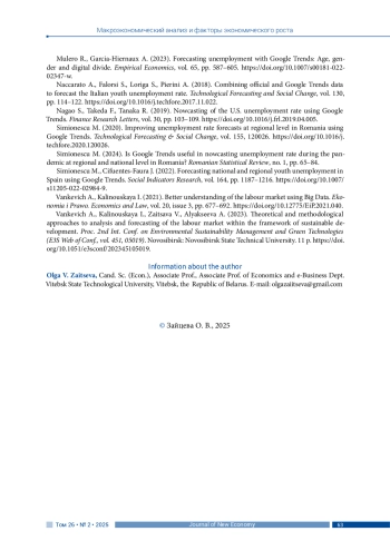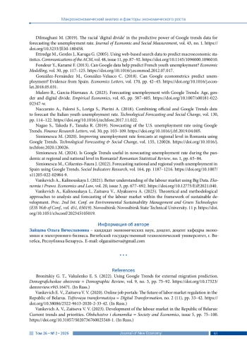 ЗАЙЦЕВА О. В. ПРОГНОЗИРОВАНИЕ БЕЗРАБОТИЦЫ В РЕСПУБЛИКЕ БЕЛАРУСЬ С ИСПОЛЬЗОВАНИЕМ ДАННЫХ ПОИСКОВЫХ ЗАПРОСОВ GOOGLE TRENDS // JOURNAL OF NEW ECONOMY. 2025. Т. 26 № 2