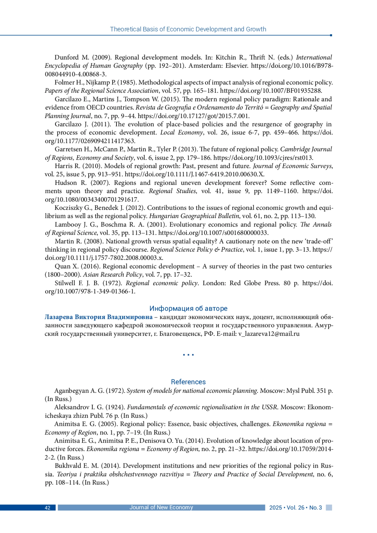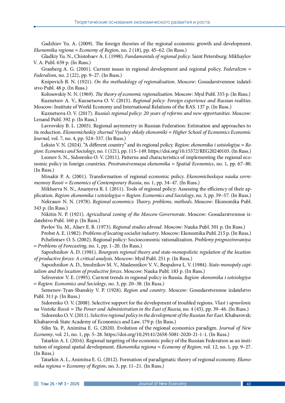 ЛАЗАРЕВА В. В. ГЕНЕЗИС НАУЧНЫХ ПРЕДСТАВЛЕНИЙ О РЕГИОНАЛЬНОЙ ПОЛИТИКЕ: КРИТИЧЕСКИЙ АНАЛИЗ ТЕОРЕТИЧЕСКИХ ПОДХОДОВ // JOURNAL OF NEW ECONOMY. 2025. Т. 26 № 3