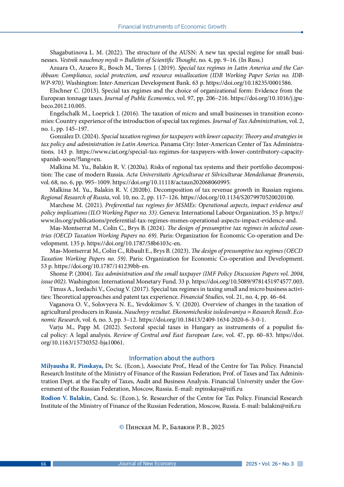 1. Аношина Ю. Ф. (2019). Особенности применения специальных налоговых режимов для субъектов малого предпринимательства в России // Russian Journal of Management. Т. 7, № 2. С. 21-25. DOI: 10.29039/article_5d4846be6331b5.96258406 EDN: NPRUNI