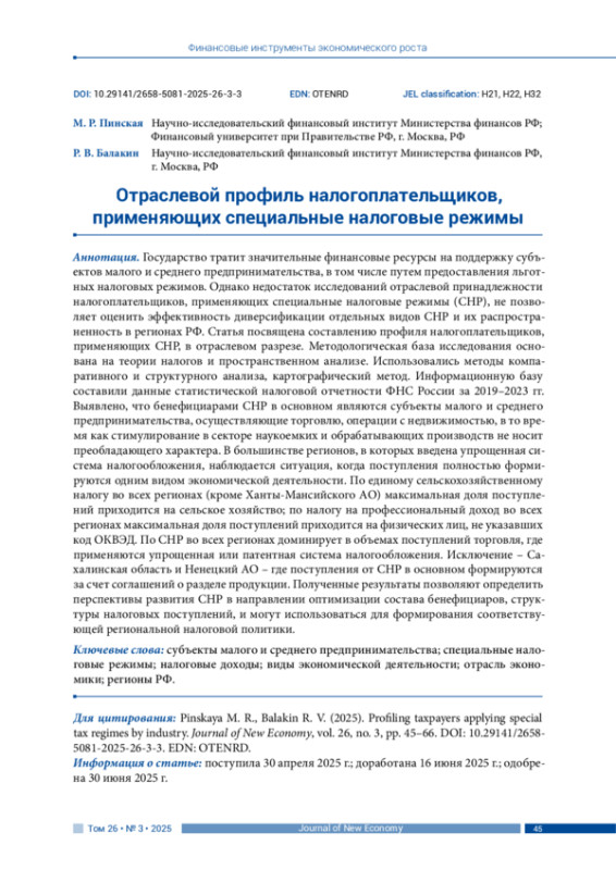 Государство тратит значительные финансовые ресурсы на поддержку субъектов малого и среднего предпринимательства, в том числе путем предоставления льготных налоговых режимов. Однако недостаток исследований отраслевой принадлежности налогоплательщиков, применяющих специальные налоговые режимы (СНР), не позволяет оценить эффективность диверсификации отдельных видов СНР и их распространенность в регионах РФ. Статья посвящена составлению профиля налогоплательщиков, применяющих СНР, в отраслевом разрезе. Методологическая база исследования основана на теории налогов и пространственном анализе. Использовались методы компаративного и структурного анализа, картографический метод. Информационную базу составили данные статистической налоговой отчетности ФНС России за 2019–2023 гг. Выявлено, что бенефициарами СНР в основном являются субъекты малого и среднего предпринимательства, осуществляющие торговлю, операции с недвижимостью, в то время как стимулирование в секторе наукоемких и обрабатывающих производств не носит преобладающего характера. В большинстве регионов, в которых введена упрощенная система налогообложения, наблюдается ситуация, когда поступления полностью формируются одним видом экономической деятельности. По единому сельскохозяйственному налогу во всех регионах (кроме Ханты-Мансийского АО) максимальная доля поступлений приходится на сельское хозяйство; по налогу на профессиональный доход во всех регионах максимальная доля поступлений приходится на физических лиц, не указавших код ОКВЭД. По СНР во всех регионах доминирует в объемах поступлений торговля, где применяются упрощенная или патентная система налогообложения. Исключение – Сахалинская область и Ненецкий АО – где поступления от СНР в основном формируются за счет соглашений о разделе продукции. Полученные результаты позволяют определить перспективы развития СНР в направлении оптимизации состава бенефициаров, структуры налоговых поступлений, и могут использоваться для формирования соответствующей региональной налоговой политики