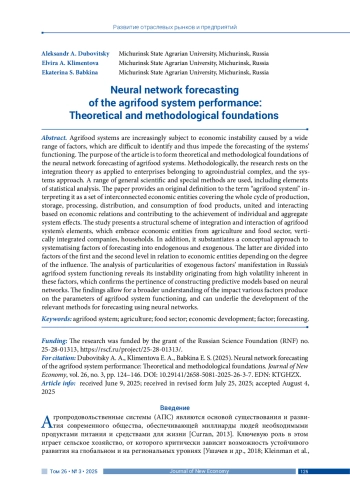 Агропродовольственные системы все больше подвержены экономической нестабильности, вызванной действием широкого спектра факторов, проблемы с идентификацией которых затрудняют предсказуемость их функционирования. Статья направлена на формирование теоретико-методических основ нейросетевого прогнозирования агропродовольственных систем. Методологической базой исследования послужили теория интеграции в приложении к предприятиям агропромышленного сектора и системный подход. Использовался комплекс общенаучных и специальных методов, включая элементы статистического анализа. Предложена авторская трактовка понятия «агропродовольственная система» как совокупности взаимосвязанных экономических субъектов, охватывающих весь цикл производства, хранения, переработки, распределения и потребления продуктов питания, объединенных и взаимодействующих между собой на основе экономических отношений и обеспечивающих достижение индивидуальных и совокупных системных эффектов. Сформирована структурная схема интеграции и взаимодействия элементов агропродовольственной системы, включающих экономические субъекты сельского хозяйства и продовольственного сектора, вертикально интегрированные структуры, домашние хозяйства населения. Обоснован концептуальный подход к систематизации эндогенных и экзогенных факторов прогнозирования. Экзогенные факторы были классифицированы как факторы первого и второго уровня по отношению к экономическим субъектам в зависимости от оказываемого влияния. Анализ особенностей проявления экзогенных факторов в функционировании агропродовольственной системы РФ выявил ее нестабильность, связанную с высокой волатильностью факторов данного типа, что определяет актуальность построения прогностических моделей на основе нейронных сетей. Результаты исследования способствуют более глубокому пониманию влияния различных факторов на параметры функционирования агропродовольственной системы и помогают разрабатывать соответствующие методы прогнозирования с использованием нейронных сетей.