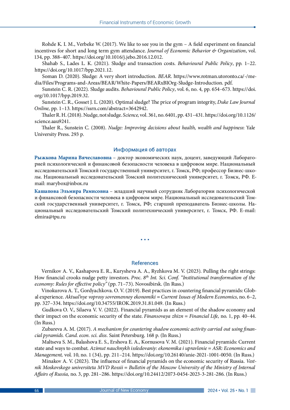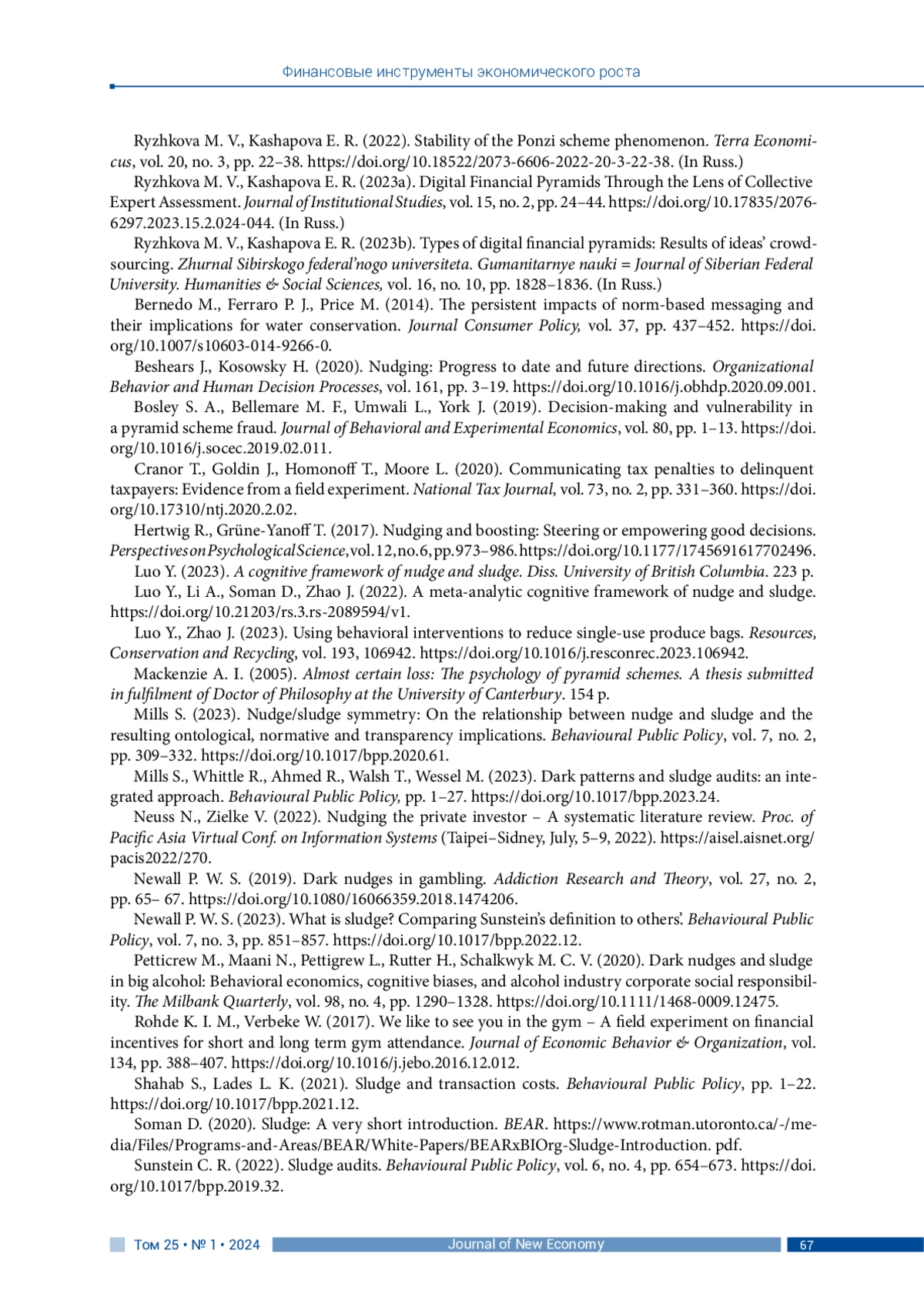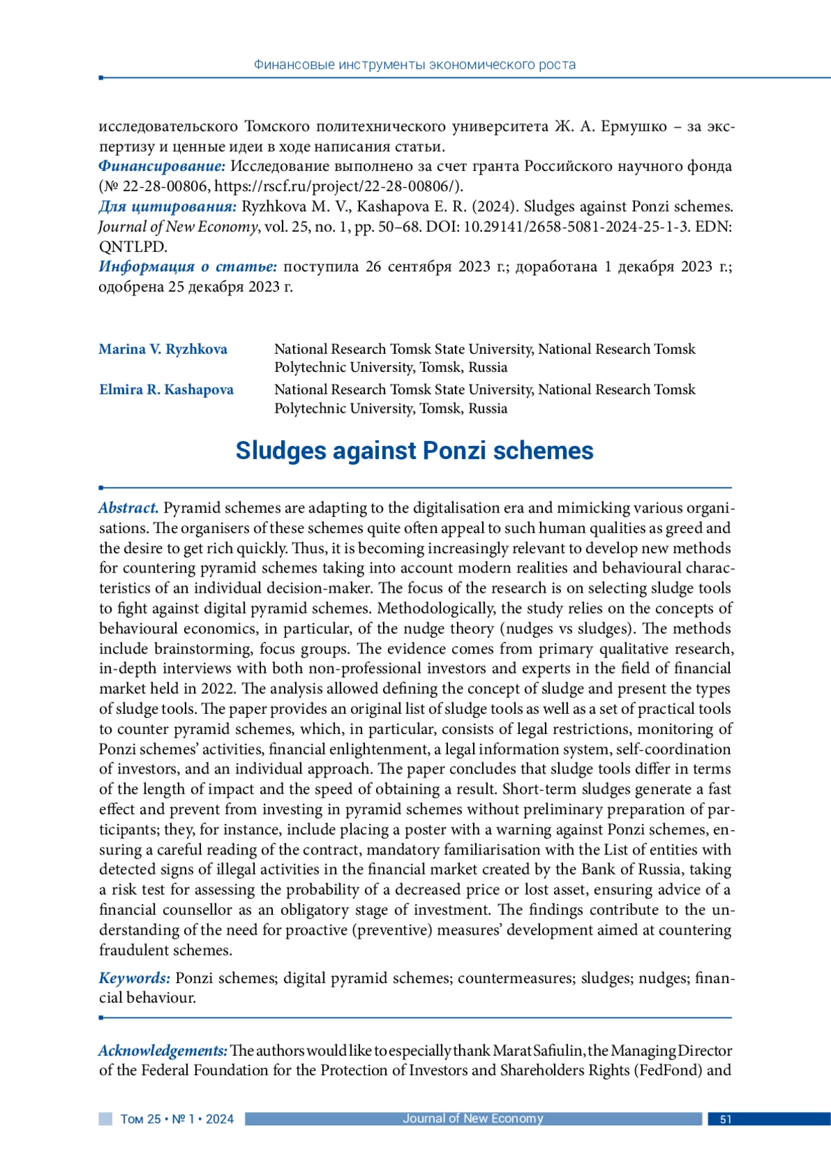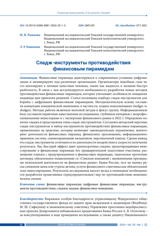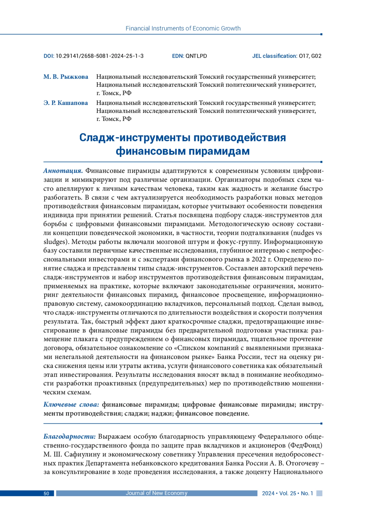 РЫЖКОВА М. В., КАШАПОВА Э. Р. СЛАДЖ-ИНСТРУМЕНТЫ ПРОТИВОДЕЙСТВИЯ ФИНАНСОВЫМ ПИРАМИДАМ // JOURNAL OF NEW ECONOMY. 2024. Т. 25 № 1