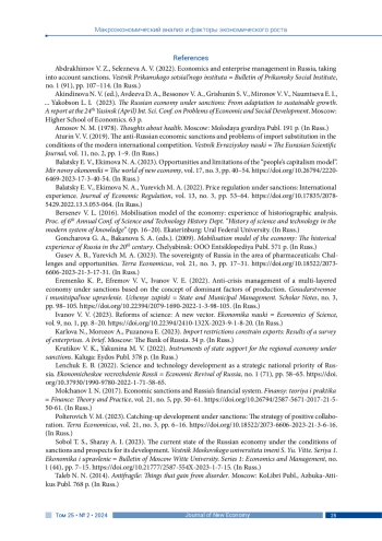2. Акиндинова Н. В., Авдеева Д. А., Бессонов В. А., Гришунин С. В., Миронов В. В., Наумцева Е. И., …, Якобсон Л. И. (2023). Экономика России под санкциями: от адаптации к устойчивому росту: доклад к XXIV Ясинской (Апрельской) междунар. науч. конф. по проблемам развития экономики и общества, Москва, 2023 г. / под ред. Акидиновой Н. В. Москва: Издательский дом Высшей школы экономики. 63 с.