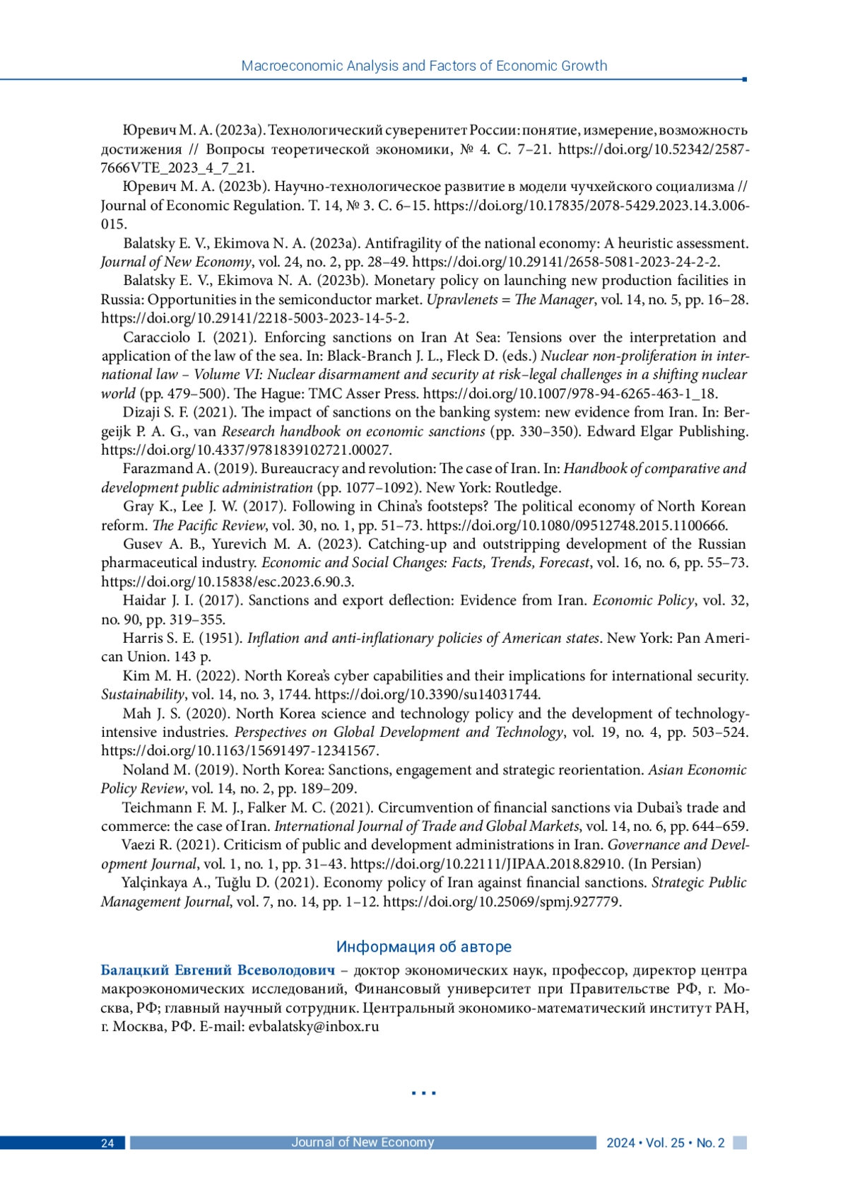 22. Balatsky E. V., Ekimova N. A. (2023a). Antifragility of the national economy: A heuristic assessment. Journal of New Economy, vol. 24, no. 2, pp. 28-49. DOI: 10.29141/2658-5081-2023-24-2-2 EDN: WLTDSU