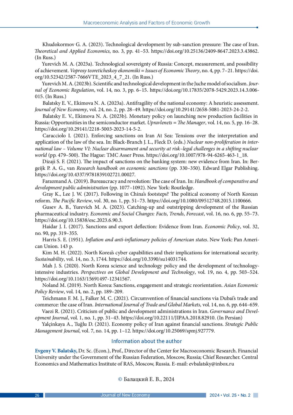 19. Худокормов Г. А. (2023). Технологическое развитие под санкционным прессингом: кейс Ирана // Теоретическая и прикладная экономика. № 3. С. 41-53. DOI: 10.25136/2409-8647.2023.3.43862 EDN: ZHCWHF
