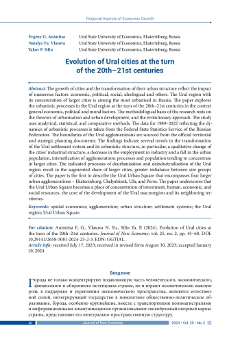 Процесс роста городов и трансформация их урбанистической структуры являются отражением многих факторов: экономических, политических, социальных, идеологических и других. Уральский регион, характеризующийся концентрацией крупнейших городов, является одним из наиболее урбанизированных в РФ. Статья посвящена анализу урбанистических процессов Уральского региона на рубеже XX–XXI вв. в контексте общеэкономических, политических и духовно-нравственных факторов. Методология исследования базируется на теориях урбанизации, градостроительства, эволюционном подходе. Использованы аналитические, статистически и сравнительные методы исследования. Информационную базу составили данные Росстата за 1989–2022 гг., характеризующие динамику урбанистических процессов. Границы агломераций Урала определялись исходя из официальных документов территориального или стратегического планирования. В результате выявлены тенденции трансформации уральской системы расселения и ее урбанистической структуры, в частности, качественное изменение отраслевой структуры городов, уменьшение числа рабочих мест в промышленности и сокращение численности городского населения, усиление агломерационных процессов и концентрации населения в крупнейших городах. Показаны последствия деурбанизации и деиндустриализации Уральского региона, среди которых увеличение доли крупнейших городов и усиление дисбаланса между группами городов различной величины. Впервые описан конструкт «Уральский урбанистический квадрат», включающий четыре крупнейшие городские агломерации – Екатеринбургскую, Челябинскую, Уфимскую и Пермскую. Подчеркивается, что Уральский урбанистический квадрат становится местом сосредоточения инвестиционных, человеческих, экономических и социальных ресурсов, ядром развития Уральского макрорегиона и его соседних территорий