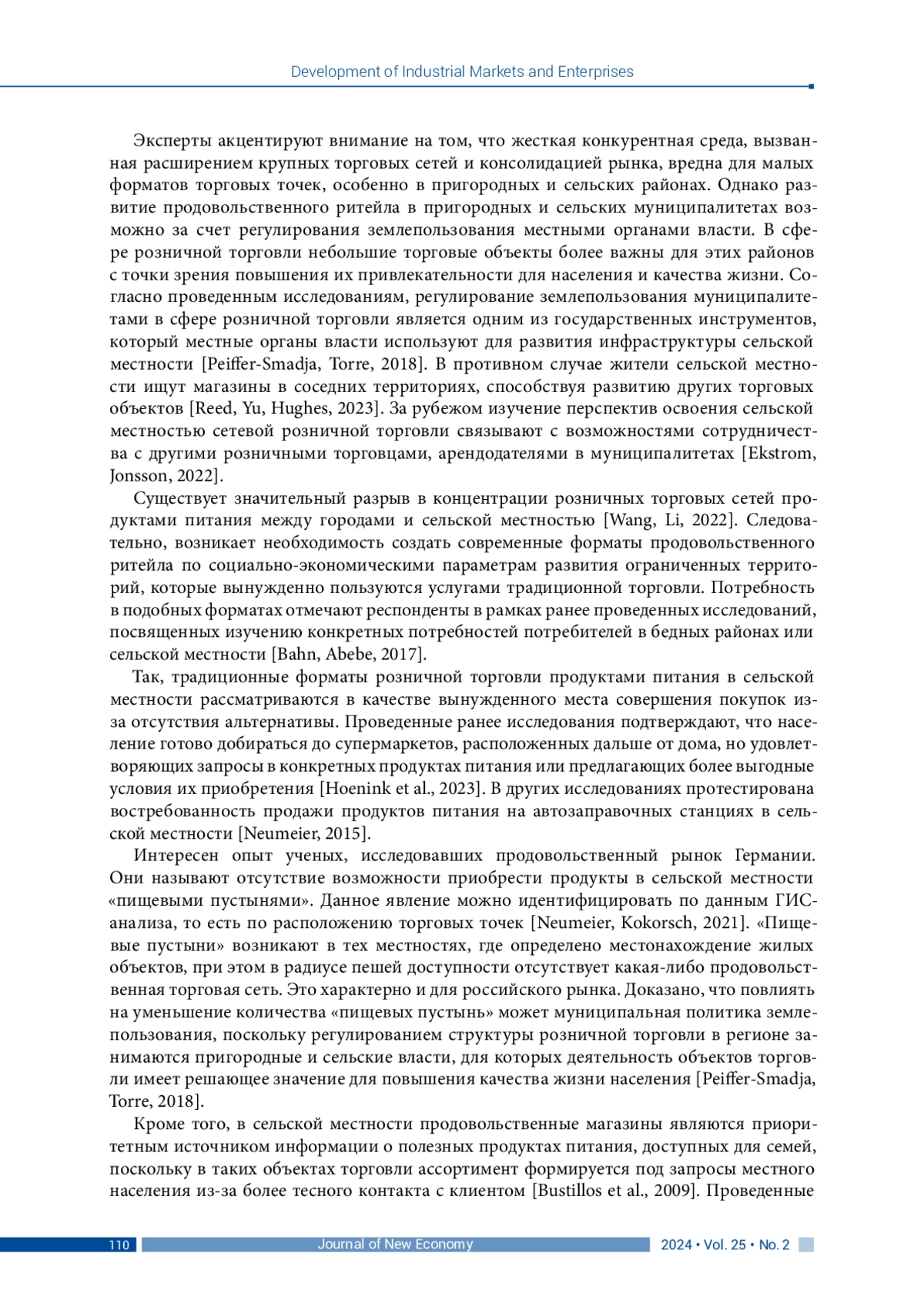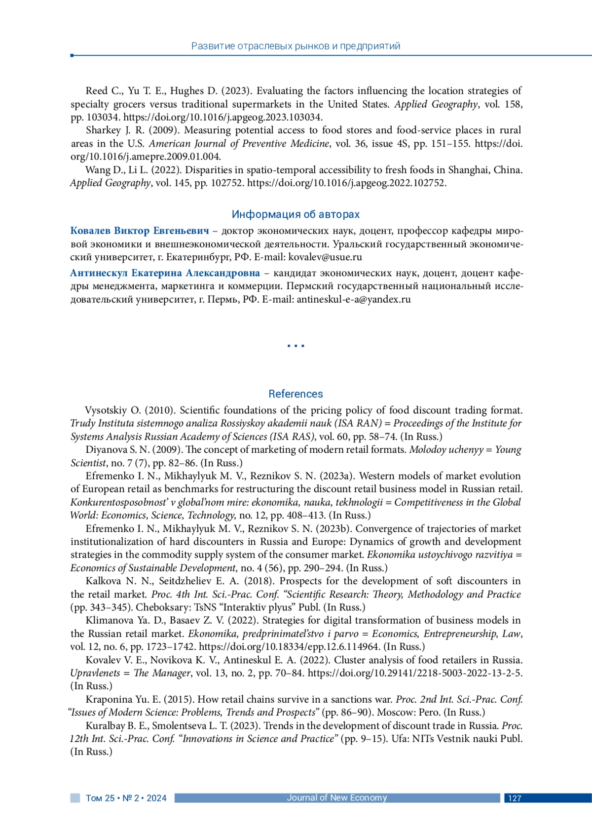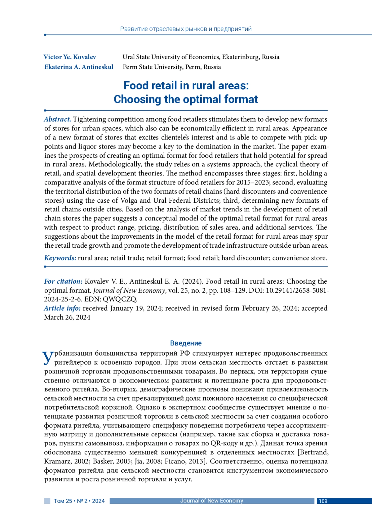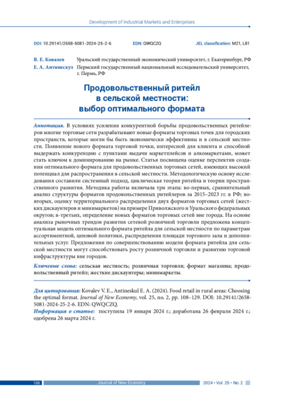 КОВАЛЕВ В. Е., АНТИНЕСКУЛ Е. А. ПРОДОВОЛЬСТВЕННЫЙ РИТЕЙЛ В СЕЛЬСКОЙ МЕСТНОСТИ: ВЫБОР ОПТИМАЛЬНОГО ФОРМАТА // JOURNAL OF NEW ECONOMY. 2024. Т. 25 № 2