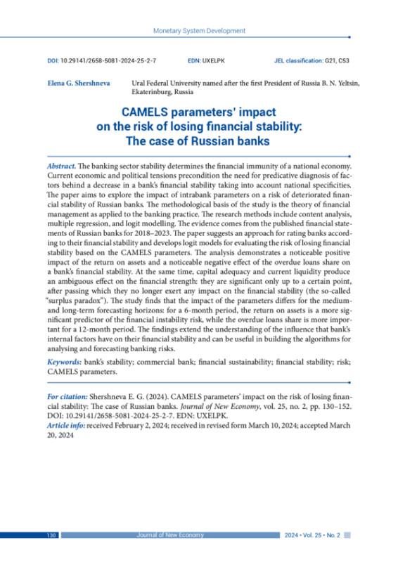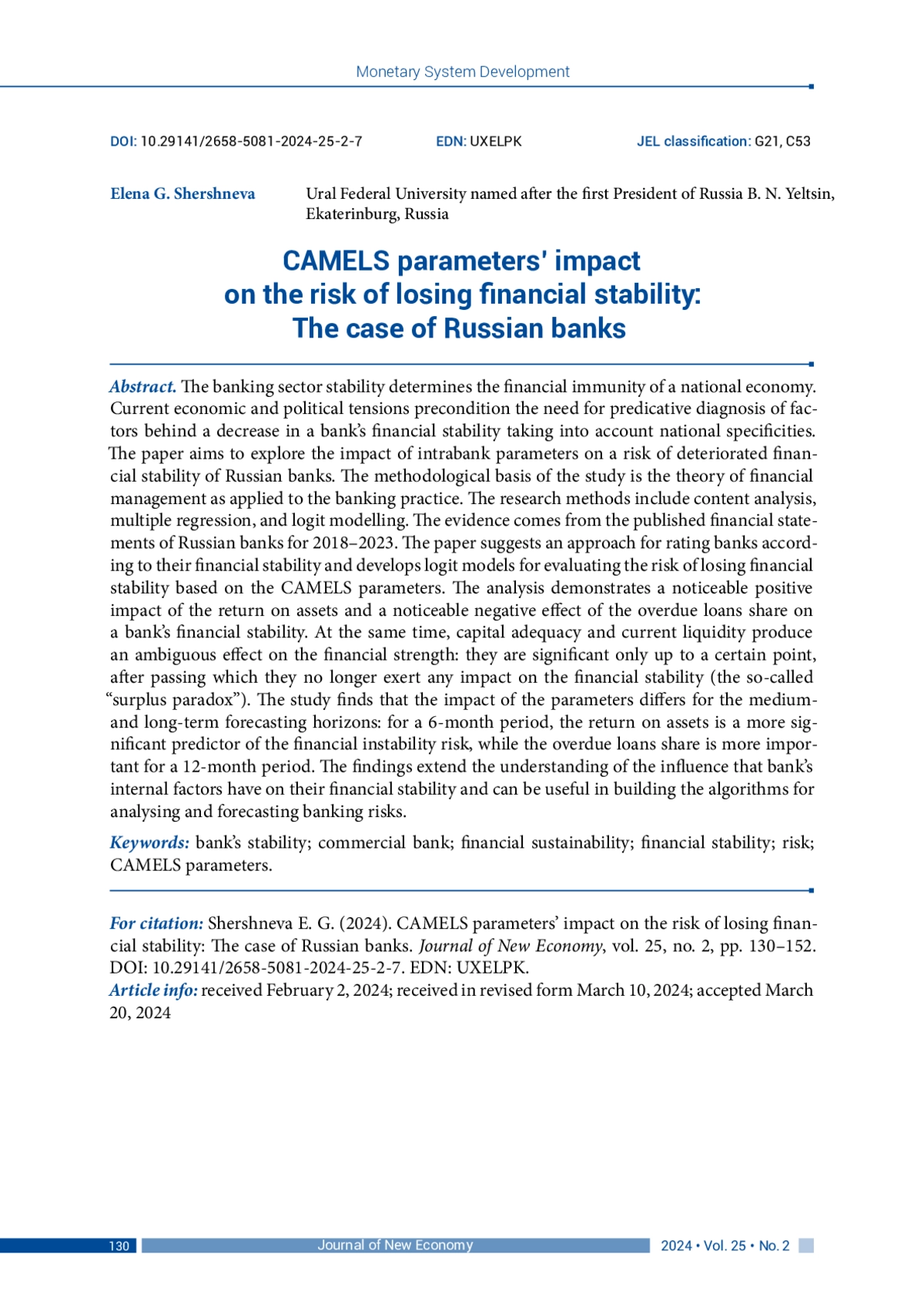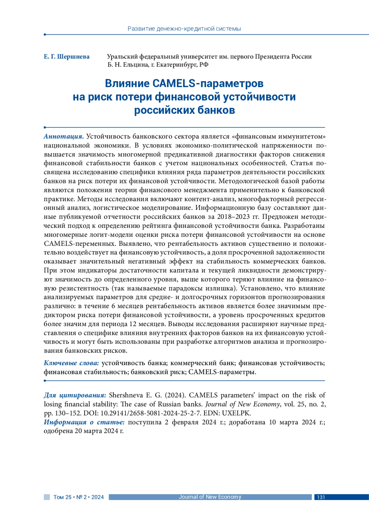 ШЕРШНЕВА Е. Г. CAMELS PARAMETERS' IMPACT ON THE RISK OF LOSING FINANCIAL STABILITY: THE CASE OF RUSSIAN BANKS // JOURNAL OF NEW ECONOMY. 2024. Т. 25 № 2