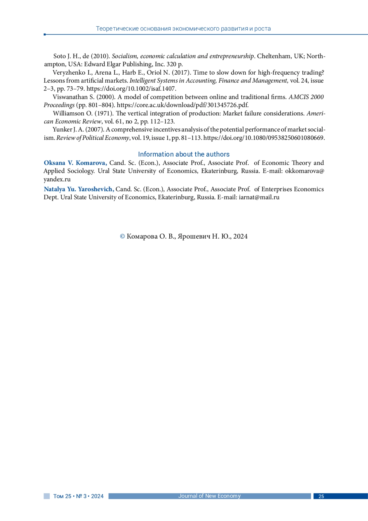 64. Yunker J. A. (2007). A comprehensive incentives analysis of the potential performance of market socialism. Review of Political Economy, vol. 19, issue 1, pp. 81-113. DOI: 10.1080/09538250601080669