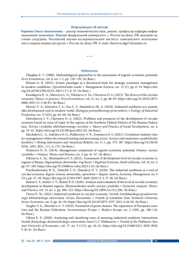 8. Никитаева А. Ю., Шестопалова О. С. (2022). Оценка уровня развития циркулярной экономики в регионах России // Региональная экономика. Юг России. Т. 10, № 3. С. 97-109. DOI: 10.15688/re.volsu.2022.3.10 EDN: SVHWTW