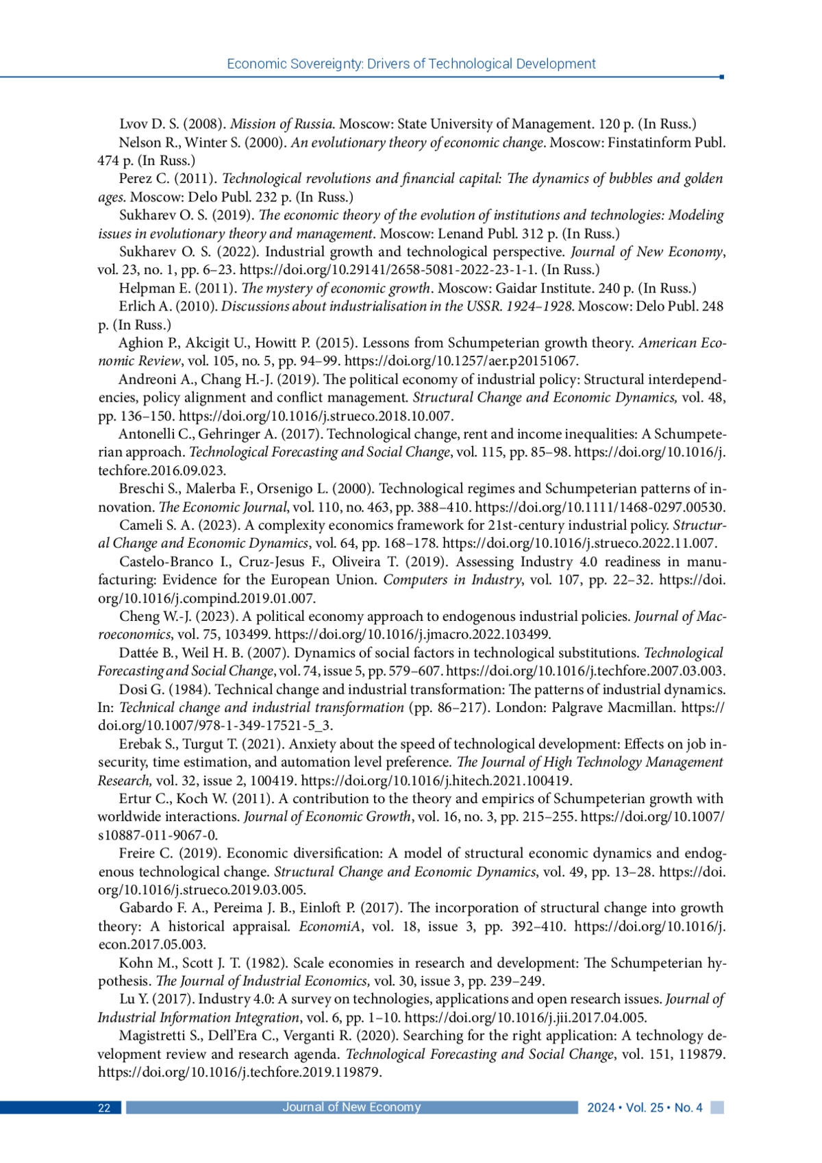 8. Сухарев О. С. (2022). Промышленный рост и технологическая перспектива // Journal of New Economy. Т. 23, № 1. С. 6-23. DOI: 10.29141/2658-5081-2022-23-1-1 EDN: RNGFTG