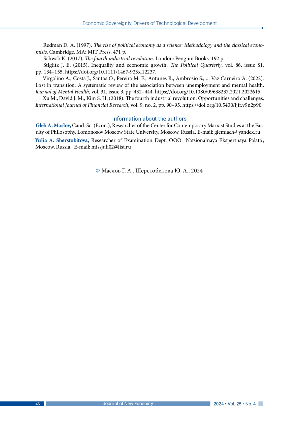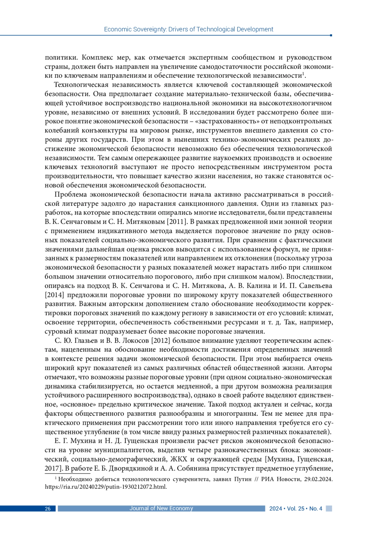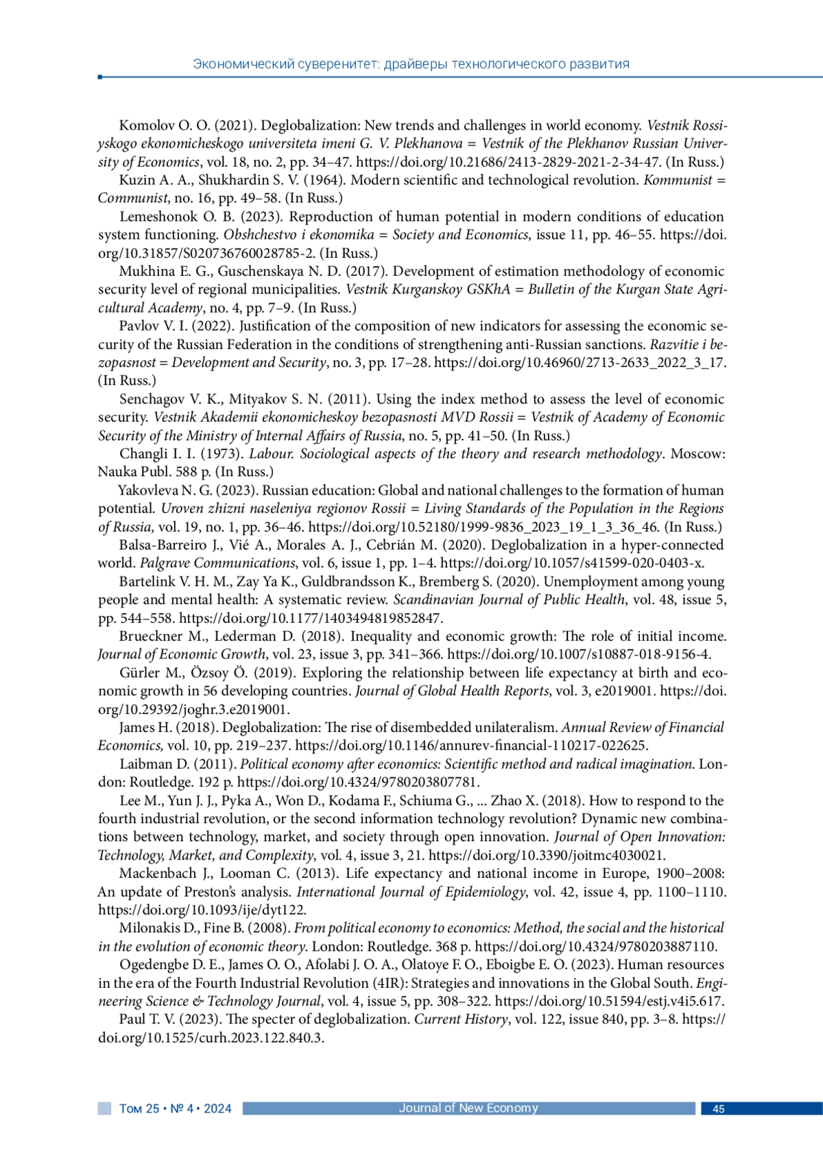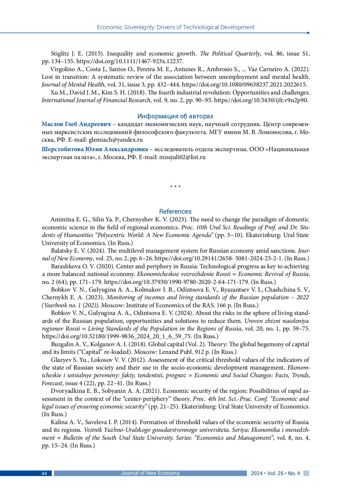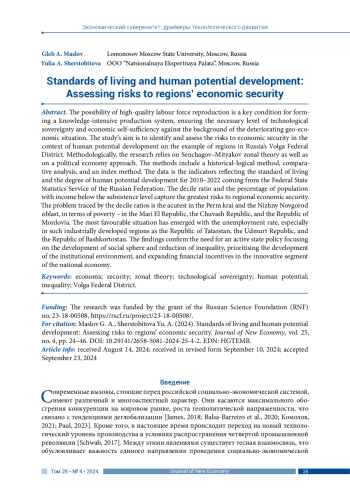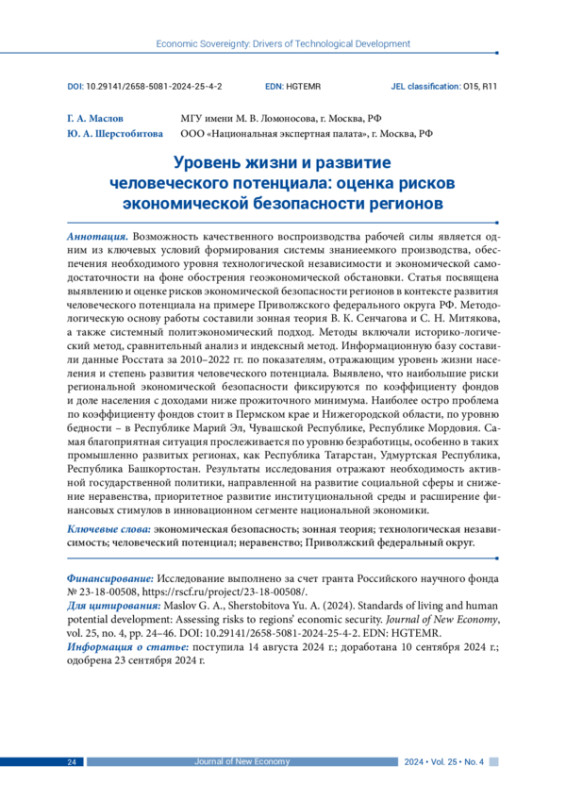 МАСЛОВ Г. А., ШЕРСТОБИТОВА Ю. А. УРОВЕНЬ ЖИЗНИ И РАЗВИТИЕ ЧЕЛОВЕЧЕСКОГО ПОТЕНЦИАЛА: ОЦЕНКА РИСКОВ ЭКОНОМИЧЕСКОЙ БЕЗОПАСНОСТИ РЕГИОНОВ // JOURNAL OF NEW ECONOMY. 2024. Т. 25 № 4