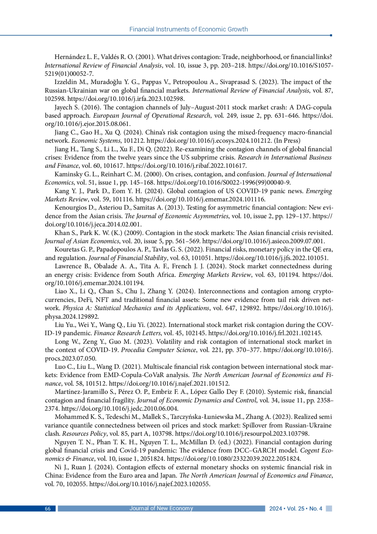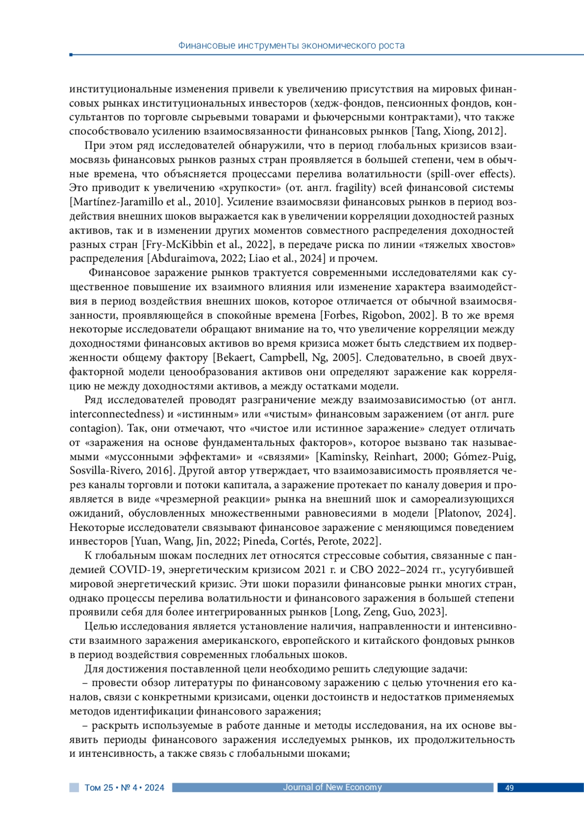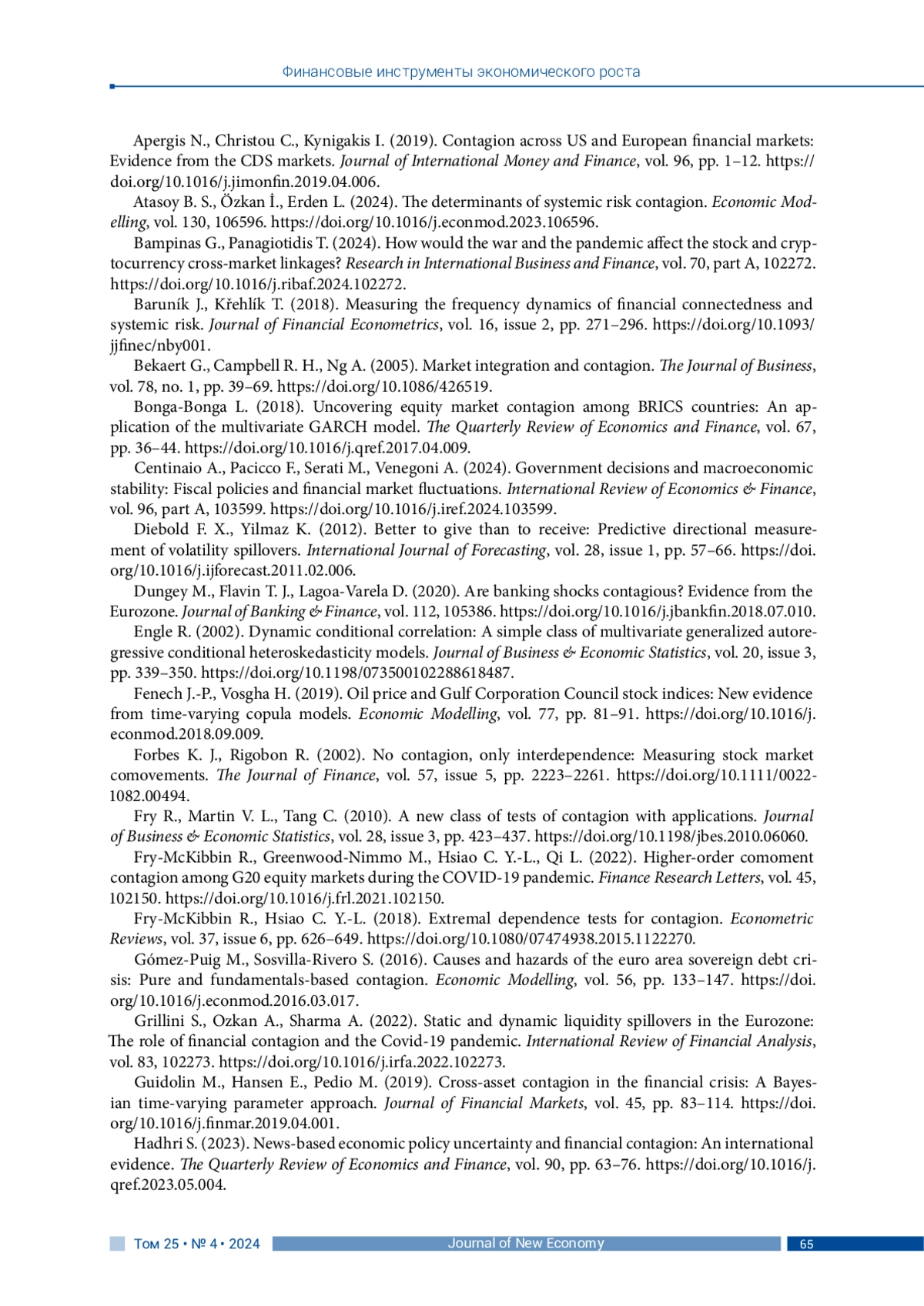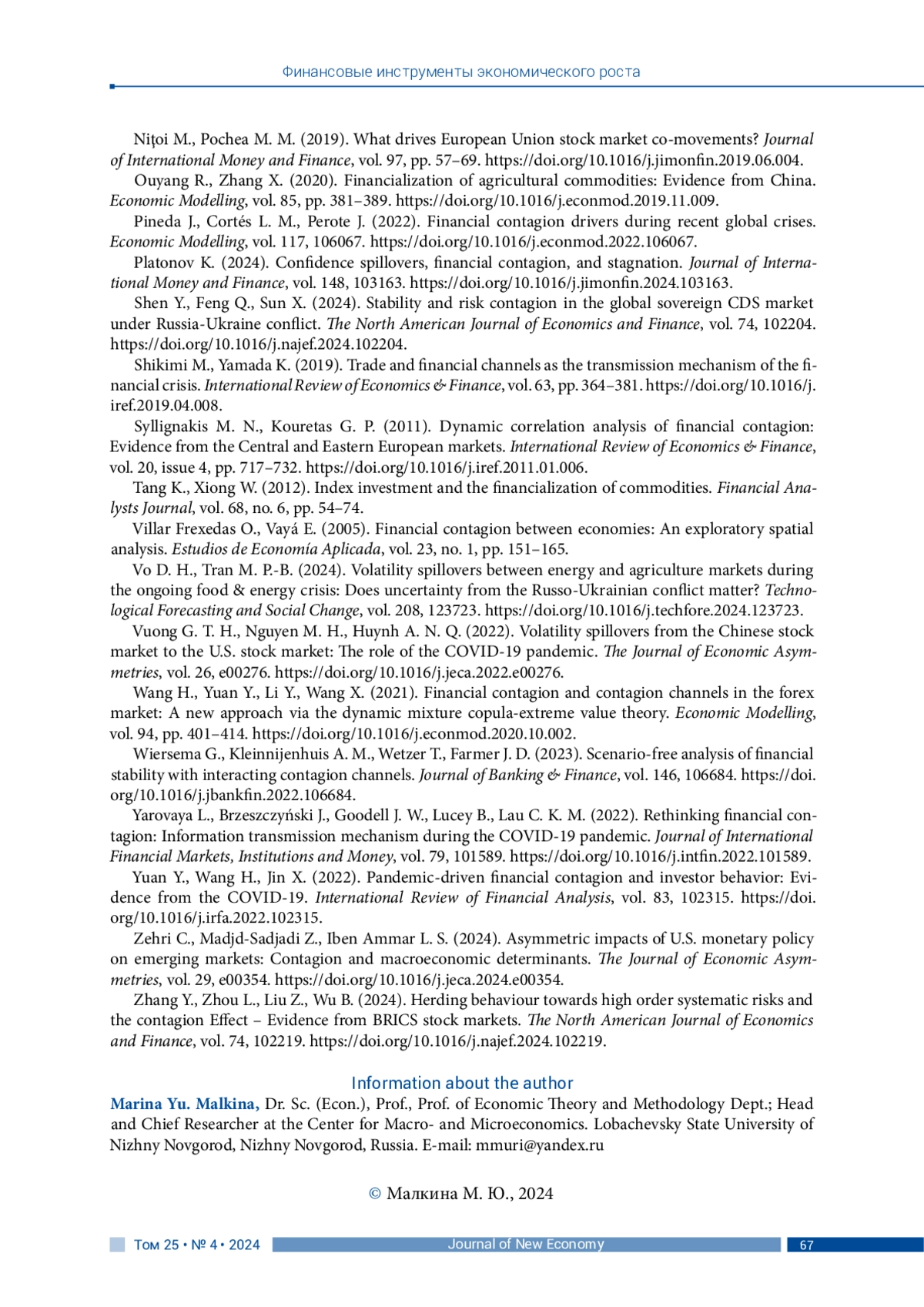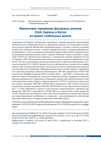 МАЛКИНА М. Ю. ФИНАНСОВОЕ ЗАРАЖЕНИЕ ФОНДОВЫХ РЫНКОВ США, ЕВРОПЫ И КИТАЯ ВО ВРЕМЯ ГЛОБАЛЬНЫХ ШОКОВ // JOURNAL OF NEW ECONOMY. 2024. Т. 25 № 4