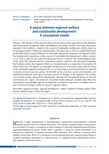 Актуальность исследования обусловлена дискуссионностью подходов к определению сущности и измерению уровня благосостояния населения региона. Особую значимость данной проблеме придает контекст концепции устойчивого развития, ориентированной на рост благосостояния и сохранение экологического баланса. Статья направлена на формирование новой теоретической модели, характеризующей взаимное влияние устойчивого регионального развития и благосостояния населения региона. Методологическую основу составили фундаментальные положения концепции устойчивого развития, теорий благосостояния, регионального и пространственного развития. Использовались методы сравнительного анализа, синтеза, концептуального моделирования. В результате установлено, что благосостояние населения региона выступает одновременно как в роли целевого ориентира ввиду наличия в своей структуре элементов идентичных сферам устойчивого развития, так и в роли ключевого фактора устойчивого регионального развития благодаря набору материальных и нематериальных, экономических и неэкономических благ, образующих экономический, социальный, экологический и институциональный элементы, обеспечивая непрерывный процесс изменений в региональной социо-эколого-экономической системе под воздействием межрегиональных, национальных и международных факторов внешней региональной среды. Представленная в статье концептуальная модель расширяет представление о процессе обеспечения устойчивого регионального развития, вносит вклад в теорию благосостояния и формирует основу для разработки методического инструментария оценки благосостояния населения региона