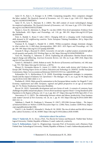 2. Ванкевич Е. В., Зайцева О. В. (2023). Развитие рынка труда Республики Беларусь на современном этапе: тенденции и приоритеты // Общество и экономика. № 5. С. 75-100. DOI: 10.31857/S020736760025548-1 EDN: WZSIKW