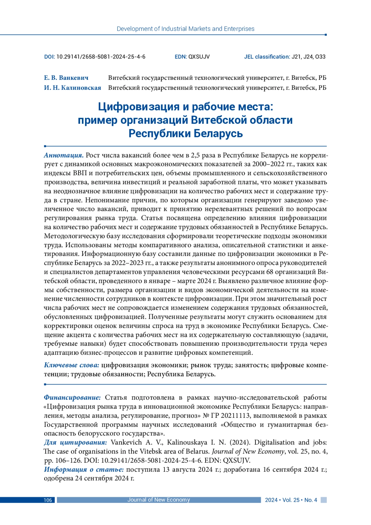 Рост числа вакансий более чем в 2,5 раза в Республике Беларусь не коррелирует с динамикой основных макроэкономических показателей за 2000–2022 гг., таких как индексы ВВП и потребительских цен, объемы промышленного и сельскохозяйственного производства, величина инвестиций и реальной заработной платы, что может указывать на неоднозначное влияние цифровизации на количество рабочих мест и содержание труда в стране. Непонимание причин, по которым организации генерируют заведомо увеличенное число вакансий, приводит к принятию нерелевантных решений по вопросам регулирования рынка труда. Статья посвящена определению влияния цифровизации на количество рабочих мест и содержание трудовых обязанностей в Республике Беларусь. Методологическую базу исследования сформировали теоретические подходы экономики труда. Использованы методы компаративного анализа, описательной статистики и анкетирования. Информационную базу составили данные по цифровизации экономики в Республике Беларусь за 2022–2023 гг., а также результаты анонимного опроса руководителей и специалистов департаментов управления человеческими ресурсами 68 организаций Витебской области, проведенного в январе – марте 2024 г. Выявлено различное влияние формы собственности, размера организации и видов экономической деятельности на изменение численности сотрудников в контексте цифровизации. При этом значительный рост числа рабочих мест не сопровождается изменением содержания трудовых обязанностей, обусловленных цифровизацией. Полученные результаты могут служить основанием для корректировки оценок величины спроса на труд в экономике Республики Беларусь. Смещение акцента с количества рабочих мест на их содержательную составляющую (задачи, требуемые навыки) будет способствовать повышению производительности труда через адаптацию бизнес-процессов и развитие цифровых компетенций