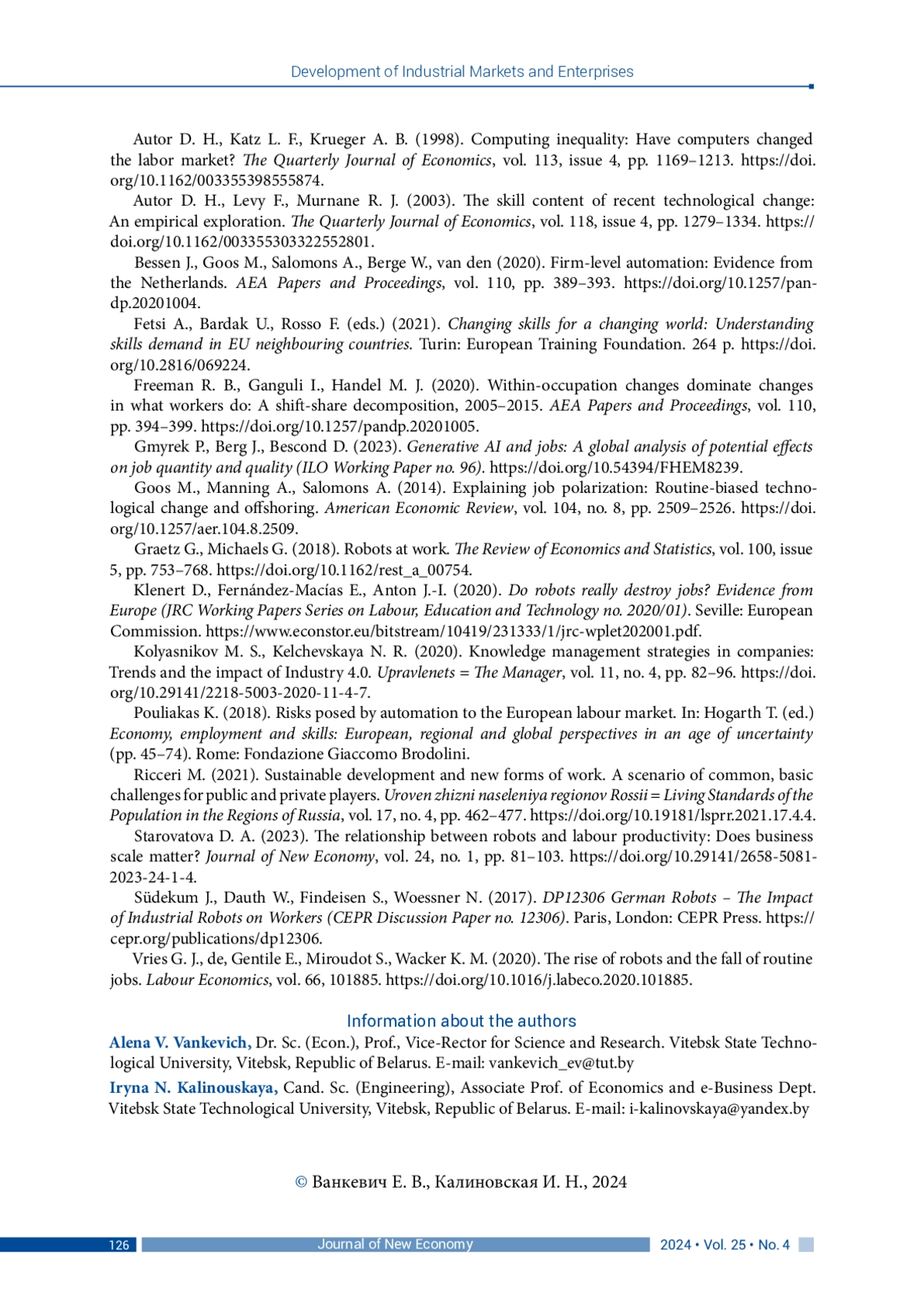 14. Acemoglu D., Restrepo P. (2020). Robots and jobs: Evidence from US labor markets. Journal of Political Economy, vol. 128, no. 6, pp. 2188-2244. DOI: 10.1086/705716 EDN: SUEWLL