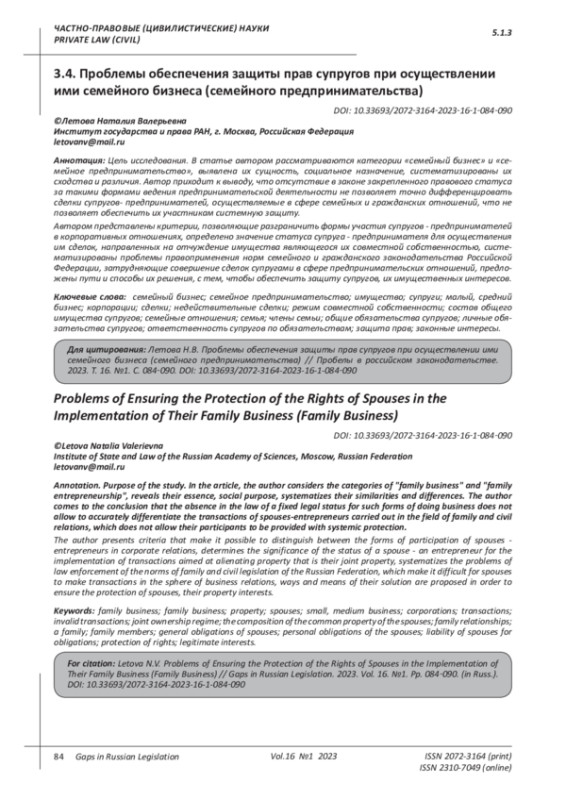 Letova N.V. Consequences of changing the marital status of spouses for business / Family business in the legal space of Russia: monograph / otv. ed. I.V. Ershova, A.N. Levushkin. Ch. 5, section 7. P. 519.