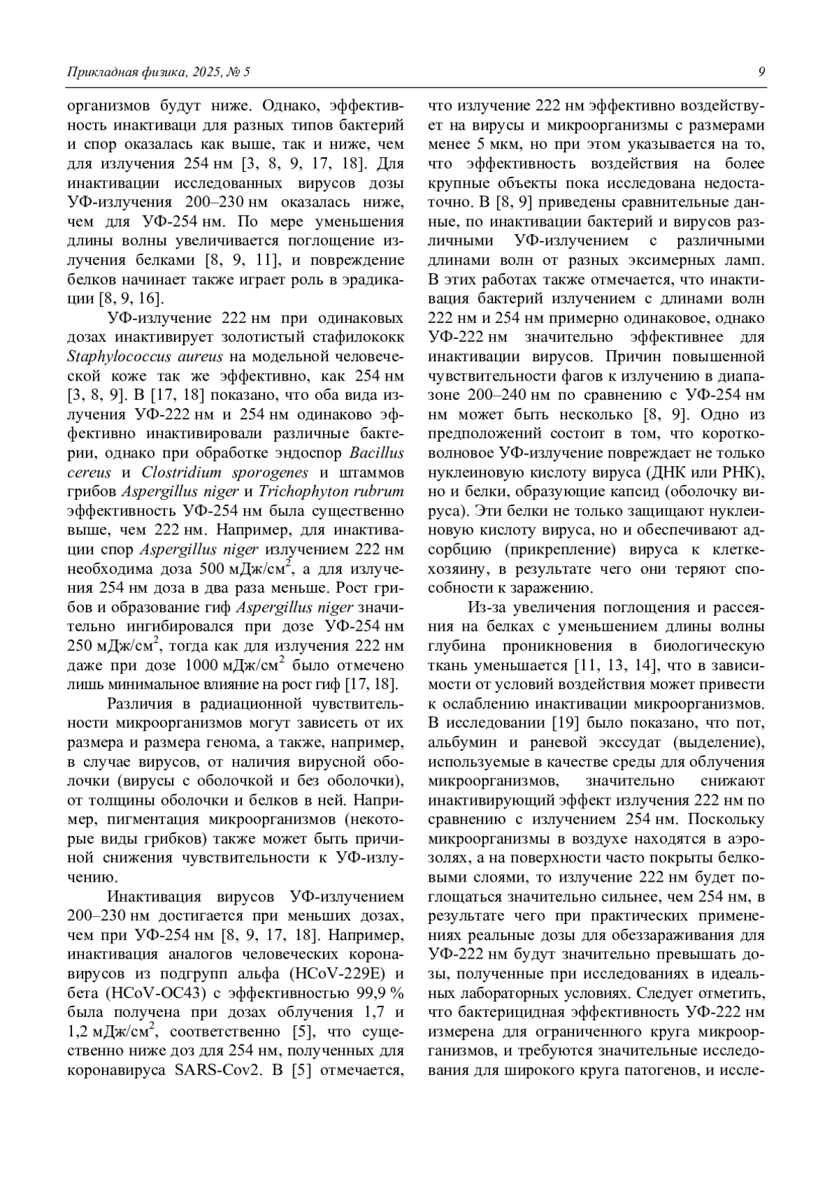 Выполнен анализ перспективности применения УФ-излучения 222 нм эксимерных KrCl-ламп для обеззараживания воздуха и поверхностей. Предполагаемые основные преимущества излучения 222 нм, заключающиеся в возможности проводить обеззараживание в присутствии людей, и более высокая бактерицидная эффективность по сравнению с длиной волны 254 нм ртутных и амальгамных ламп низкого давления, проходят экспериментальную проверку. Исследования показывают противоречивые результаты о безопасности такого излучения для кожи и для глаз млекопитающих. Инактивация вирусов и простых бактериологических штаммов УФ-излучением 222 нм и 254 нм достигается при аналогичных УФ-дозах, однако для более крупных объектов (эндоспоры, грибы, гифы грибов) существенное преимущество имеет УФ-излучение 254 нм. Эффективность генерации УФ-излучения 222 нм в промышленных KrCl-лампах составляет 3–5 %, что существенно меньше, чем для ртутных и амаль-гамных ламп низкого давления 30–35 %.