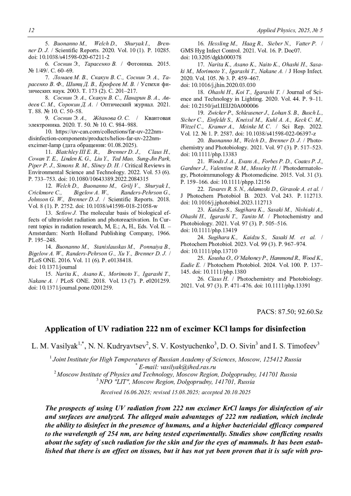 - Buonanno M., Welch D., Brenner D. J. / Pho-tochemistry and Photobiology. 2021. Vol. 97 (3). P. 517–523. doi: 10.1111/php.13383