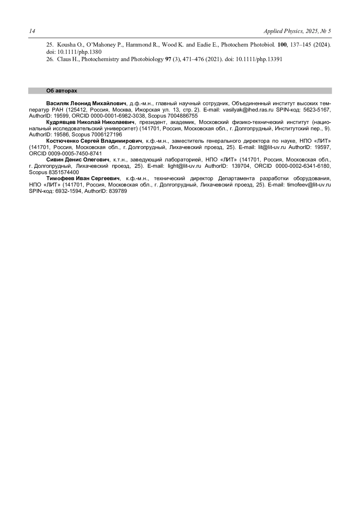 Василяк Л. М., Кудрявцев Н. Н., Костюченко С. В., Сивин Д. О., Тимофеев И. С.