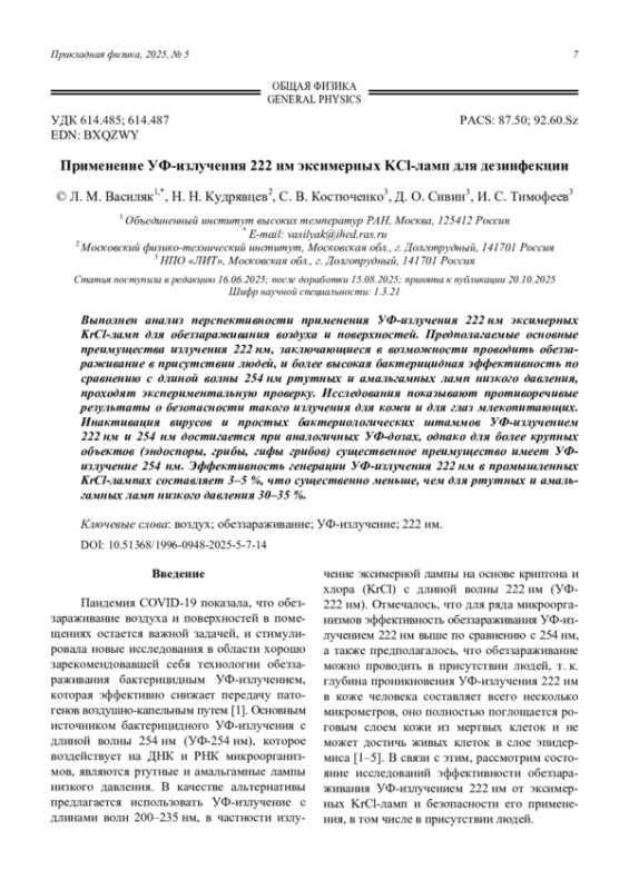 Применение УФ-излучения 222 нм эксимерных KCl-ламп для дезинфекции