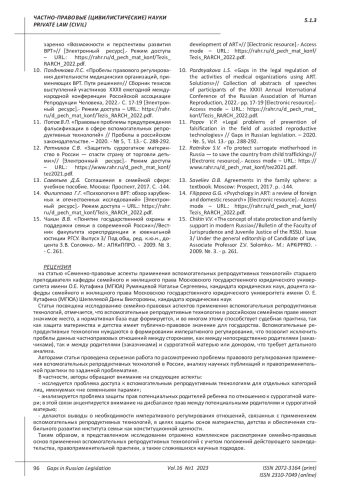 11. Попов В.П. “Правовые проблемы предупреждения фальсификации в сфере вспомогательных репродуктивных технологий” // Пробелы в российском законодательстве. - 2020. - № 5, Т. 13.- С. 288-292. EDN: VNKKXF