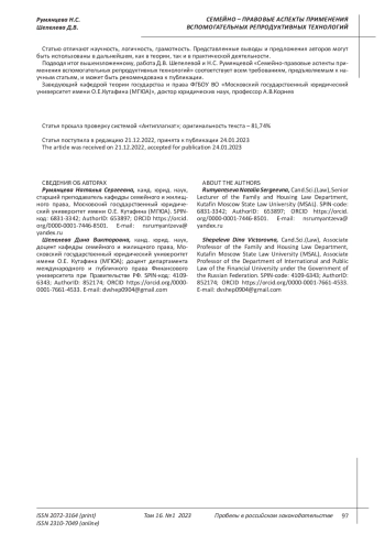 Актуальность исследования семейно-правовых аспектов применения вспомогательных репродуктивных технологий обусловлена тем, что вспомогательные репродуктивные технологии в российском семейном праве имеют значимое место, а нормативная база по данному вопросу еще формируется, и во многом этому способствует судебная практика и политика государственной власти, так как защита материнства и детства имеет публично-правовое значение для России. Наиболее сильную окраску данное значение приобрело в свете дополнения законодательства Указом Президента Российской Федерации от 09.11.2022 № 809, утверждающим основы государственной политики по сохранению и укреплению традиционных российских духовно - нравственных ценностей, определяющим, что политика России исходит из приоритета традиционных духовно - нравственных ценностей, среди которых фигурируют такие факторы, как крепкая семья, брак (союз мужчины и женщины), многодетность1. Вспомогательные репродуктивные технологии могут оказать как положительное влияние на данные факторы, так и негативное влияние, так как отсутствует целостный механизм ответственности сторон - участников вспомогательных репродуктивных технологий. Поэтому основной целью статьи станет изучение вспомогательных репродуктивных технологий, необходимости их императивного регулирования, пробелы данных частноправовых правоотношений между сторонами - родителями (заказчиками), суррогатной материю, донорами. В заключении выделена проблематика доступа к вспомогательным репродуктивным технологиям для отдельных категорий лиц, именуемых «не семейными парами», проблематика защиты прав потенциальных родителей ребенка по отношению к суррогатной матери, отмечен дисбаланс прав между потенциальными родителями и суррогатной матерью, подчеркнута необходимость императивного регулирования отношений, связанных с применением вспомогательных репродуктивных технологий, в целях защиты основ материнства, детства и обеспечения стабильного развития института семьи как конституционной ценности.