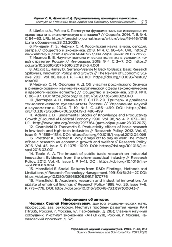 6. Миндели Л. Э., Черных С. И. Российская наука: вчера, сегодня, завтра // Общество и экономика. 2018. № 4. С. 60-84. URL: item.asp?id=34941196 (дата обращения: 28.03.2025). EDN: XNSBHF