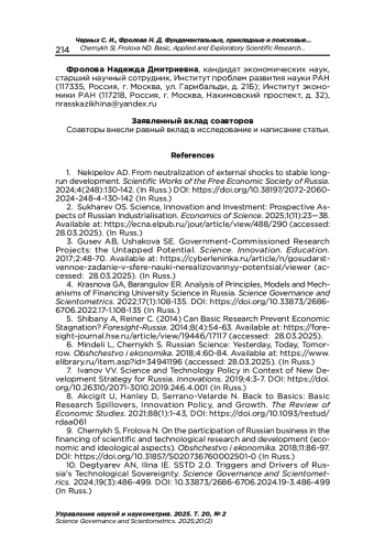 9. Черных С. И., Фролова Н. Д. Об участии российского бизнеса в финансировании научно-технологической сферы (экономические и идеологические аспекты) // Общество и экономика. 2018. № 11. С. 86-97. DOI: 10.31857/S020736760002501-0 EDN: YPHOFV